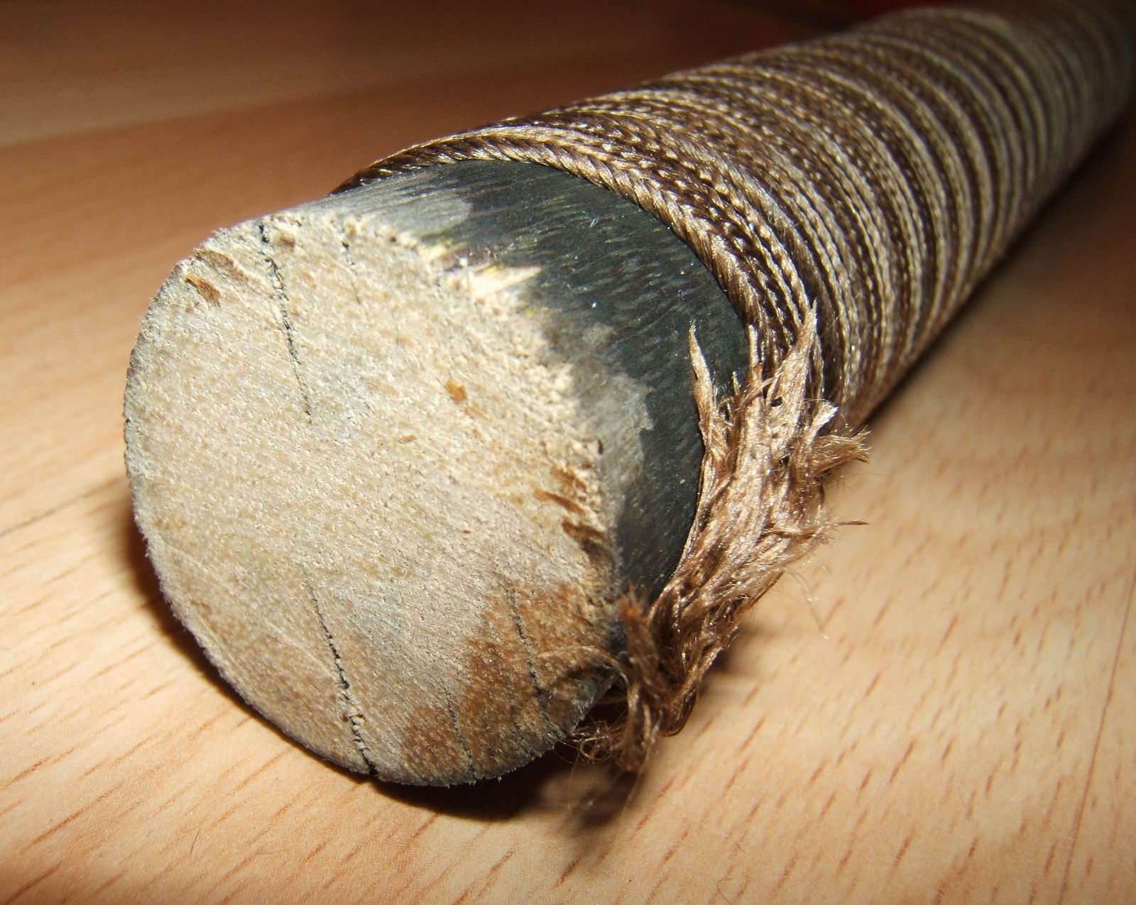 Vor der Verwendung muss die Ito vorbereitet werden. Das bedeutet, sie muss gestreckt werden. Dazu wird die mit Wasser voll gesogene Ito stramm um ein Rundholz gewickelt. Hierzu verwendete ich ein Stück vom alten Holzstiel eines Gartengerätes. Um ein 4 Meter langes Band, inklusive seiner durch das Strecken zugewonnene Längenmaß, vollständig aufzuwickeln, wobei das Band eng nebeneinander liegt, genügte ein Rundholz mit einem Durchmesser von 28 mm und einer Länge von 43 cm. Das nasse Band läßt das saugfähige Holz zusätzlich minimal aufquellen, was der Wirkung des Streckens noch entgegen kommt.