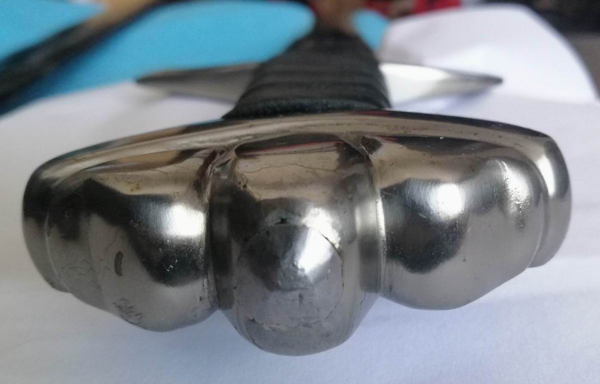 Der Knauf ist mit der Angel vernietet. Die Griffumwicklung aus Leder fühlt sich an wie Gummi. Charakteristisch für die mehr funktionale als Scheide aus dickem Leder ist die Trageschlaufe am oberen Beschlag und das stumpfe Ortblech.
