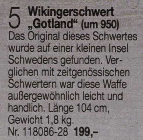 In einem Konvolut von mehreren Wikingerschwertern war dieses hier enthalten. Hersteller und Markenname sind unbekannt. Recherchen auf einigen englischsprachigen Plattformen waren noch nicht zielführend. Der größte Teil der Befragten und ich vermuten, dass das Schwert in den 90er Jahren von Windlass Steelcrafts gefertigt wurde. Diese Firma wurde 1943 gegründet und hat eine sehr große und wechselnde Produktpalette. Leider blieb eine direkte E-Mail-Anfrage an Windlass Steelcrafts unbeantwortet.