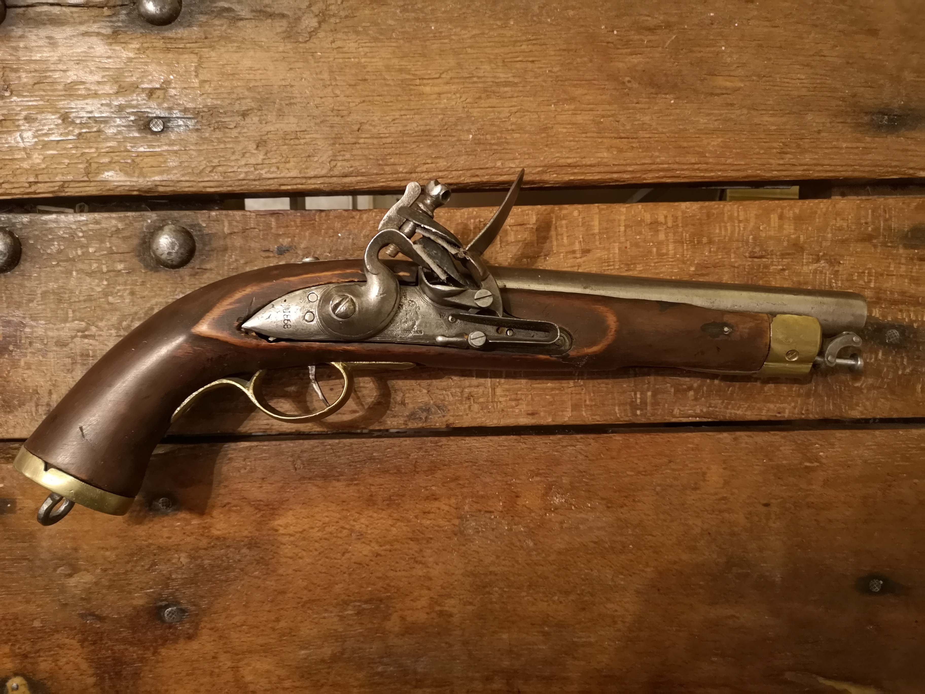 Lese ich 1868 oder 1858 ? Beide Angaben würden nicht zu einer Steinschlosspistole passen ( oder irre ich mich da ??? ) Könnte aber auch 1808 ( mit Kratzer? ) sein, dieses Datum wäre schlüssiger.