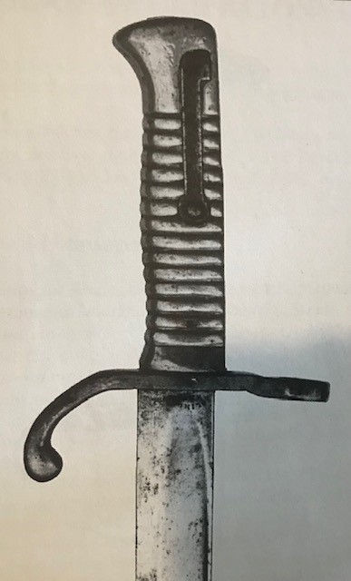 Ehemaliges erleichtertes Werder 1869 Bajonett, damals über die USA nach Uruguay exportiert, wo es ein neue Messing Parierstange bekommen hat und dort die Modelbezeichnung „Artilleriebajonett M1895“ hätte (für das Mausergewehr 1895).