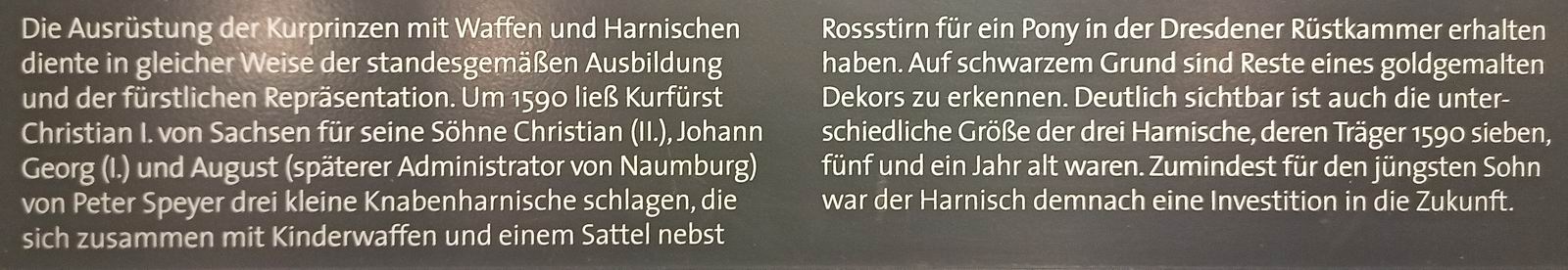Die Ausbildung der Kurprinzen mit Waffen und Harnischen diente in gleicher Weise der standesgemäßen Ausbildung und der fürstlichen Repräsentation. Um 1590 ließ Kurfürst Christian I. von Sachsen für seine Söhne Christian (II.) und Johann Georg (I.) und August (späterer Administrator von Naumburg) von Peter Speyer drei kleine Knabenharnische Schlagen, die sich zusammen mit Kinderwaffen und einem Sattel nebst Rossstirn für ein Pony in der Dresdner Rüstkammer erhalten haben. Auf schwarzem Grund sind Reste eines goldgemalten Dekors zu erkennen. Deutlich sichtbar ist auch die unterschiedliche Größe der drei Harnische, deren Träger 1590 sieben, fünf und ein Jahr alt waren. Zumindest für den jüngsten Sohn war der Harnisch demnach eine Investition für die Zukunft. (Quelle: Dresden, Residenzschloss, Rittersaal)