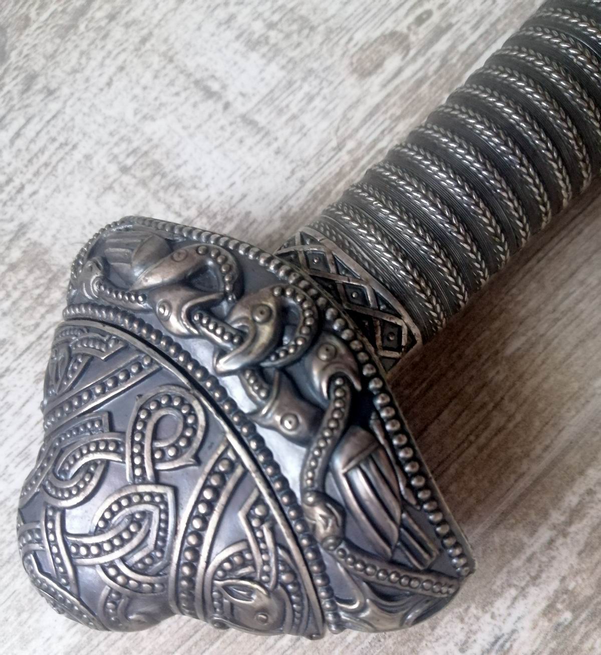 Gekauft habe ich es 2021 im Konvolut mit 11 weiteren Wikingerschwertern. Der Griff ist aus Buntmetall gefertigt und die Klinge aus 420er rostfreiem Edelstahl. Es ist somit ein reines Deko-Objekt, weshalb ich es unmittelbar nach dem Auspacken wieder verkauft hatte. Wollte es dennoch mal hier gezeigt haben.