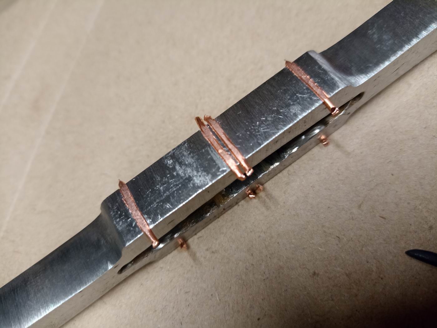 Für die Einlagen kam 1,5mm² Kupferdraht aus Stromkabel zum Einsatz. Einhämmern, polieren, fertig.