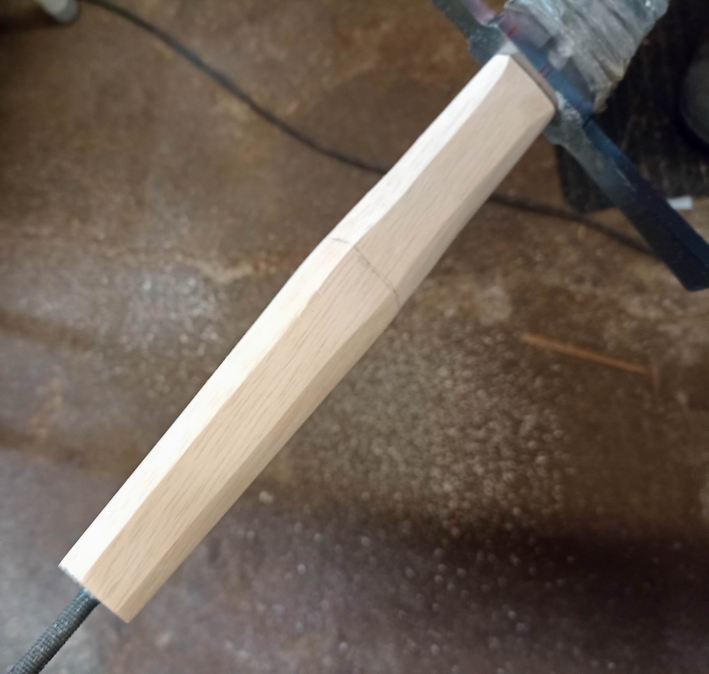 Die Hilze war eine Herausforderung. Ursprünglich wollte ich sie aus Walnussholz machen, aber durch die Wuchsform des Astes habe ich es nicht hinbekommen. Weitere Versuche mit anderen Rundhölzern scheiterten ebenfalls. Letztendlich kam ein kantiges Stück besser, Die Hilze besteht aus zwei teilen in denen die Angel des Schwertes eingeschnitzt wurde. Darüber habe ich eine Schnur gewickelt und darüber weiches, raues Leder. Schnur und Leder wurden jeweils mit Holzleim auf den Untergrund geklebt und anschließend wieder mit einer Schnur umwickelt um das Leder anzupressen.