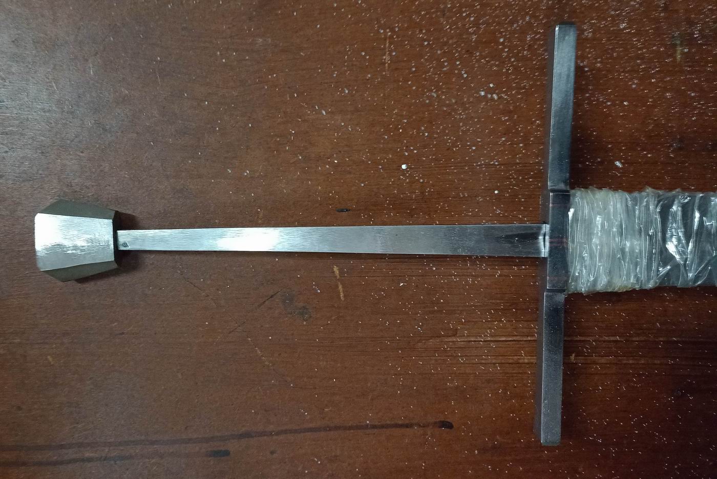 Nachdem ich am Freitag von einem Schwertfreund einen gebrauchten Knauf zugesandt bekam, habe ich das Schwert wieder umgebaut. Dieser Scheibenknauf ist etwa das Dreifache schwerer, so dass der POB jetzt bei 7 cm vor der Parierstange liegt. Vorher lag er bei 12 cm.