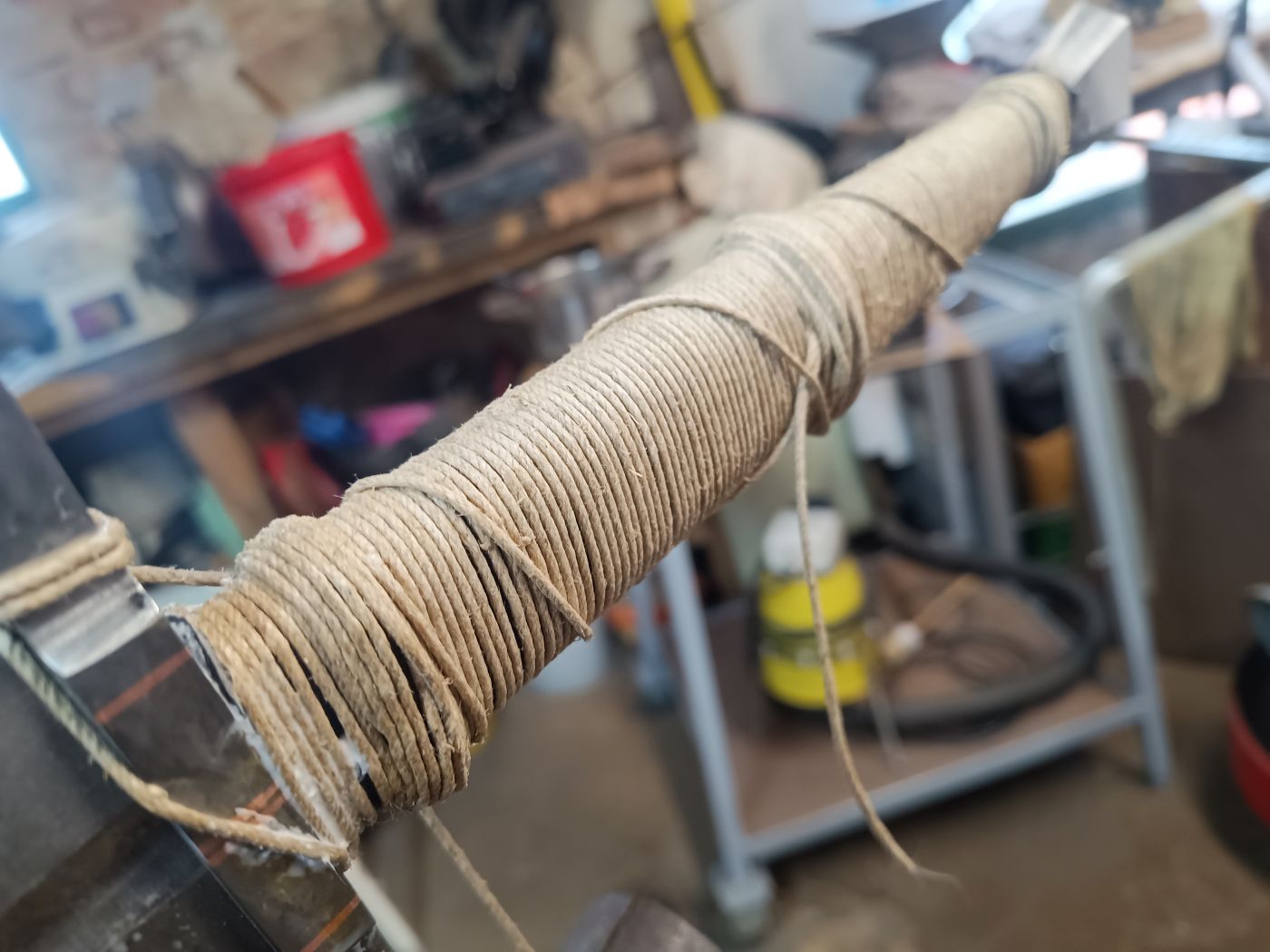 Tatsächlich handelt es sich in meinem Fall nicht um Schnur. Die schnurförmige Struktur stammt von der Hanfkordel, die ich beim Kleben des Leders stramm um die Hilze wickle. Da ich meine Arbeitsschritte meist dokumentiere, hier mal ein paar Fotos von der Griffbelederung mit anschließender Fixierung mittels Hanfschnur. Bislang hatte ich auch unterm Leder eine Schnur gewickelt, aber das mache ich seit diesem Jahr nicht mehr.