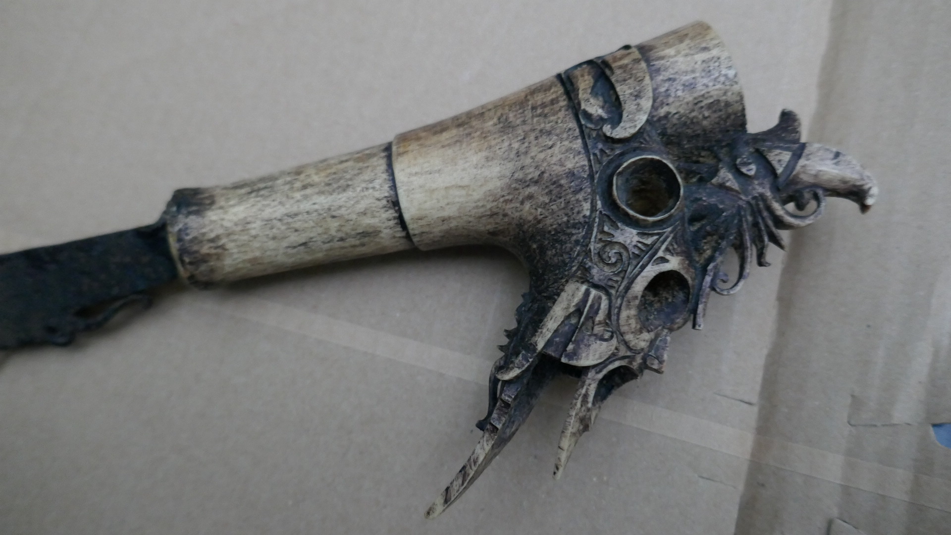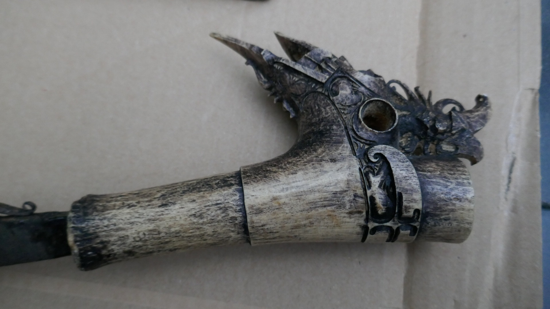 Griff ist reich verziert und könnte Horn oder Bein sein.