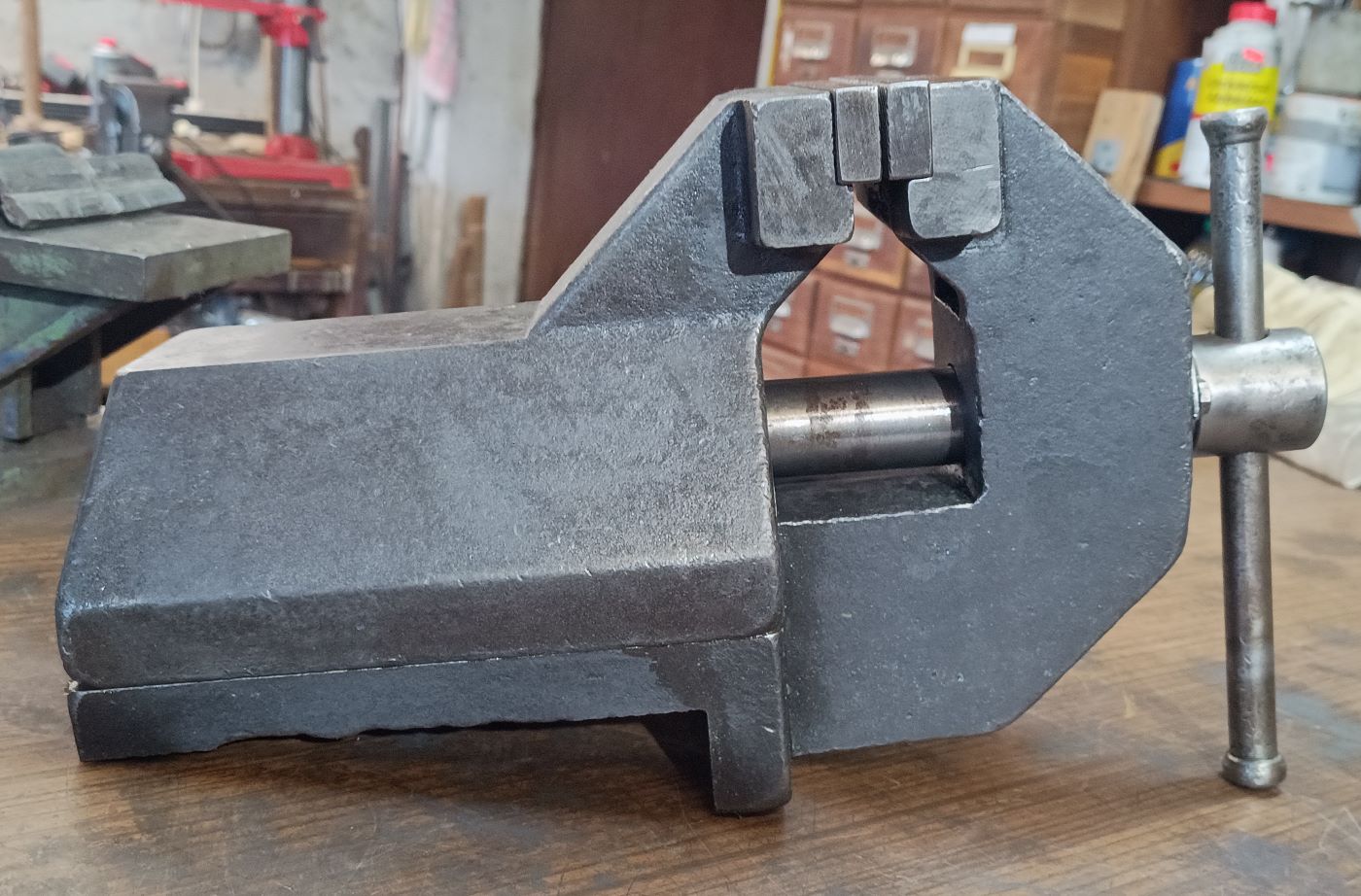 Ich habe fünf Parallelschraubstöcke unterschiedlicher Art in Gebrauch. Dieser hier kam zuletzt hinzu. Er gehörte dem Vater einer Freundin. Seit er 1990 herum mit nur 50 Lebensjahren starb, blieb er im Gartenschuppen stehen. Über die Jahre wollten ihn schon einige Bekannte der Freundin haben, teilweise sogar, um ihn auf den Schrott zu bringen. Das lehnte sie stets ab und wartete auf den Augenblick, jemanden zu vertrauen, der ihn wieder herrichtet und seiner ursprünglichen Bestimmung zuführt. Nun bin ich es geworden.