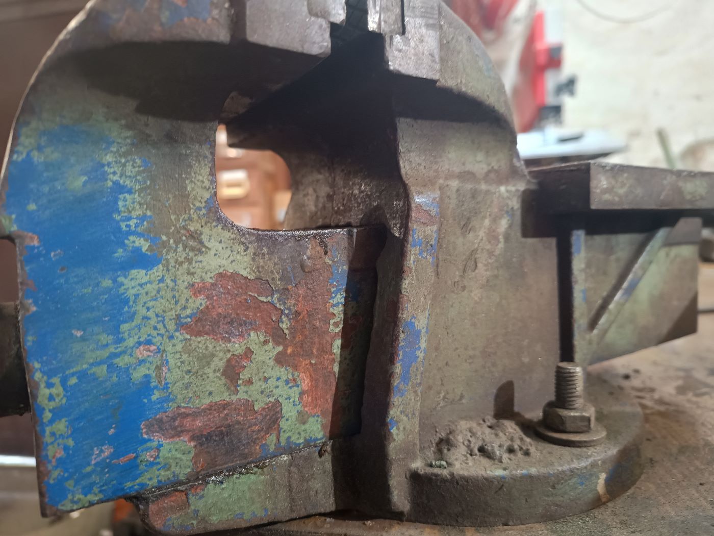 Auf der Suche nach den ultimativen Schraubstock als drehbare Variante nehme ich auf Flohmärkte jeden mit, wenn er mir preislich entgegen kommt. Hier eine Ausführung als Tischschraubstock. Aber auch bei diesem war mir schnell klar, es ist nicht die Größe, die mir für den dauerhaften Gebrauch in der Werkstatt zufrieden stellt. Er ist mir einfach zu klein.