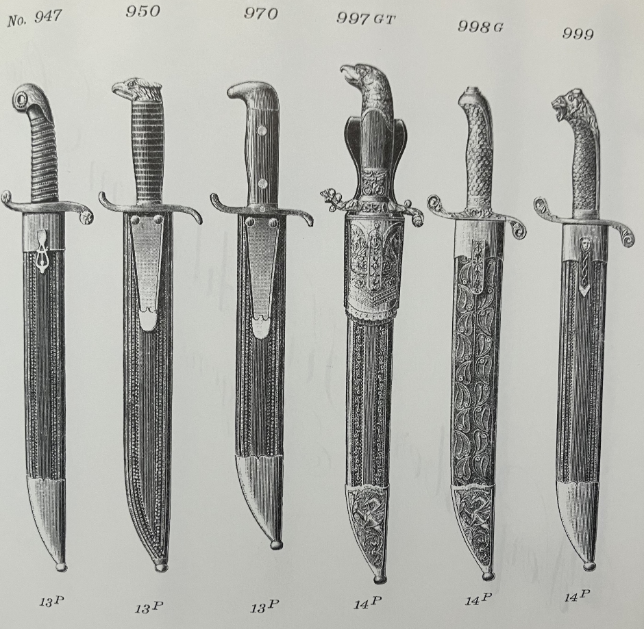 Man darf nicht vergessen, dass in Solingen (und auch anderen Produktionsstädten) alles gefertigt wurde, was der Kunde wollte. So gibt es in einem Weyersberg-Musterbuch-Nachdruck (1892 oder 1893) eine Rubrik "Hauer" mit c.23 Tafeln, auf denen Hauer, Hirschfänger, Bowie-Messer, Macheten und große Messer abgebildet sind, teils mit Klingen, die dieser hier sehr ähneln. Hier einmal eine Tafel, die ich aber tatsächlich ausgewählt habe wegen des Gefäßes.
