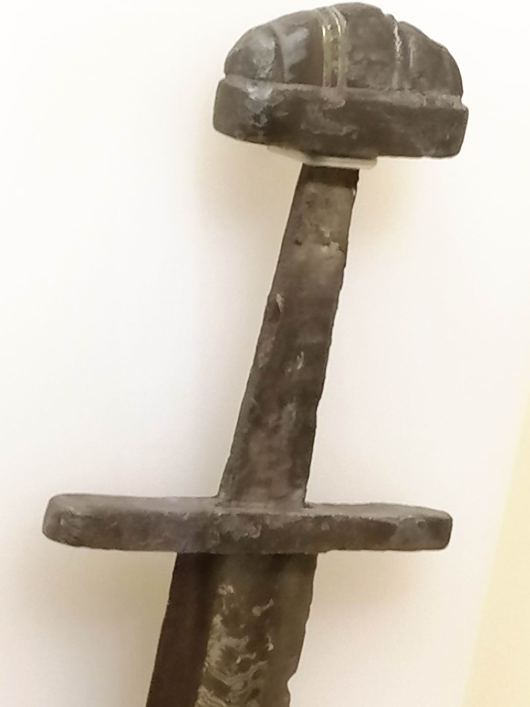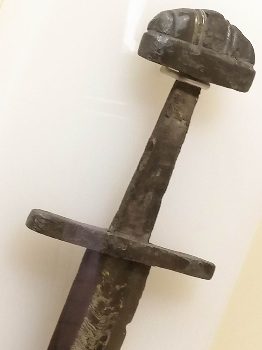Archäologischen Landesmuseums Brandenburg, hat meines Erachtens eine Damaststahlkinge. Jedenfalls erkennt man farbliche Strukturen. Im Knauf sind in den Vertiefungen zwei der Einlagen erhalten geblieben.