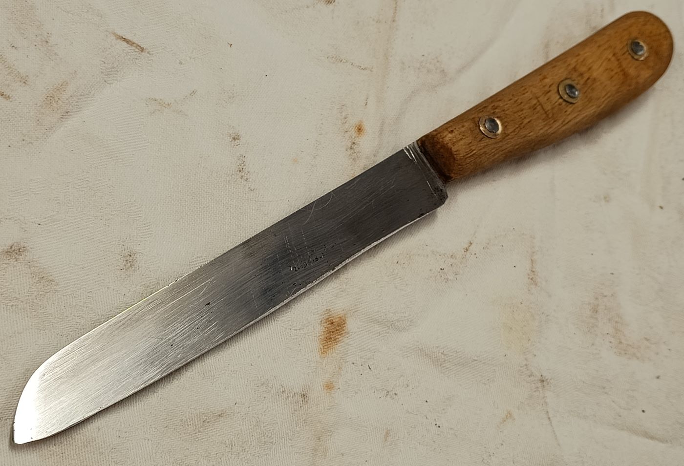 Anbei das Messer. Die Holzgriffschalen bedecken die Vollangel und sind mit drei dünne Querniete verbunden, mit Messingscheiben als Unterlagen. Das Alter des Messers schätze ich auf 70 bis 80 Jahre.