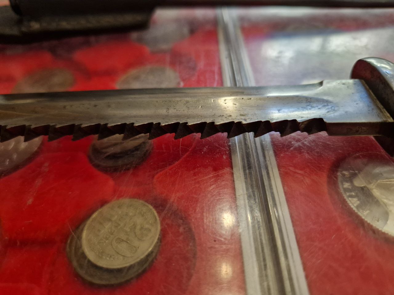 Naja, ein stark überarbeitetes Stück mit nicht zugehöriger Scheide. Säge ansich dürfte so original sein.
