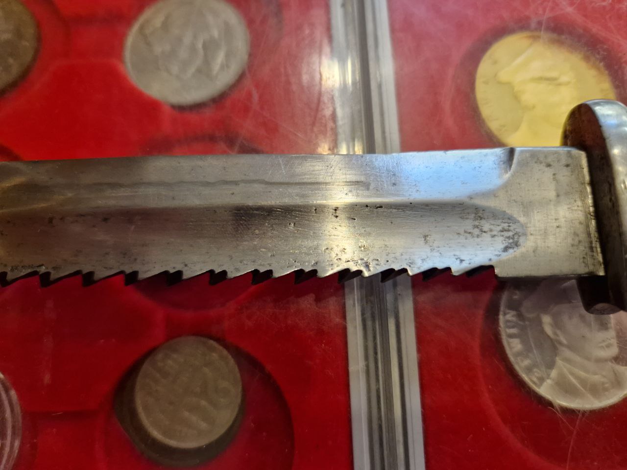 bei einen Antiquitätenhändler ist mir folgendes Stück in die Hände gekommen, das ich allerdings noch nicht erworben habe, sondern von diesem erst einmal Fotos gemacht habe. Die Maße habe ich auch noch nicht genommen und ich mache auch noch gerne weitere Fotos, wenn Ihr mir sagt, was für Details ich fotografieren soll. Bemerkenswert finde ich den kaiserlichen Abnahmestempel auf dem Klingenrücken, weitere Stempel, wie Hersteller oder dergleichen fehlen. Mir kommt es vor, als ob man eine Not-Seitengewehrklinge in der Weimarer Zeit oder später komplett neu versorgt hat. Mich interessiert besonders, ob die Säge "echt" ist, also nicht nachträglich, wie soft, eingefräst wurde.