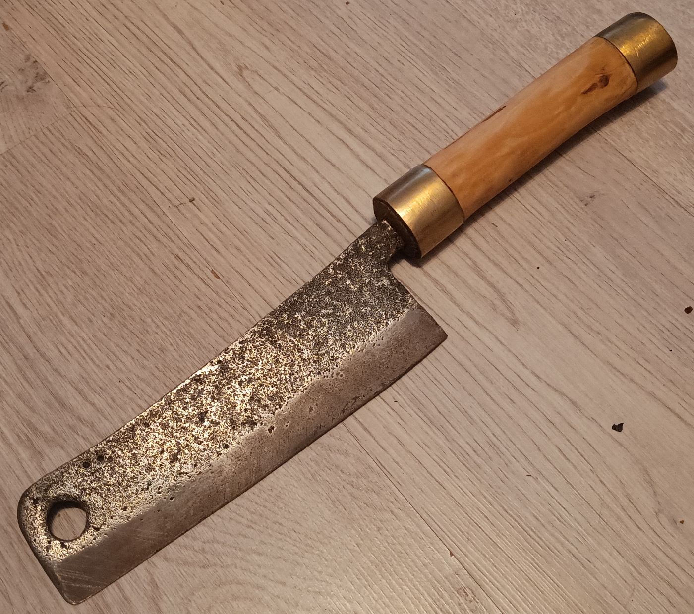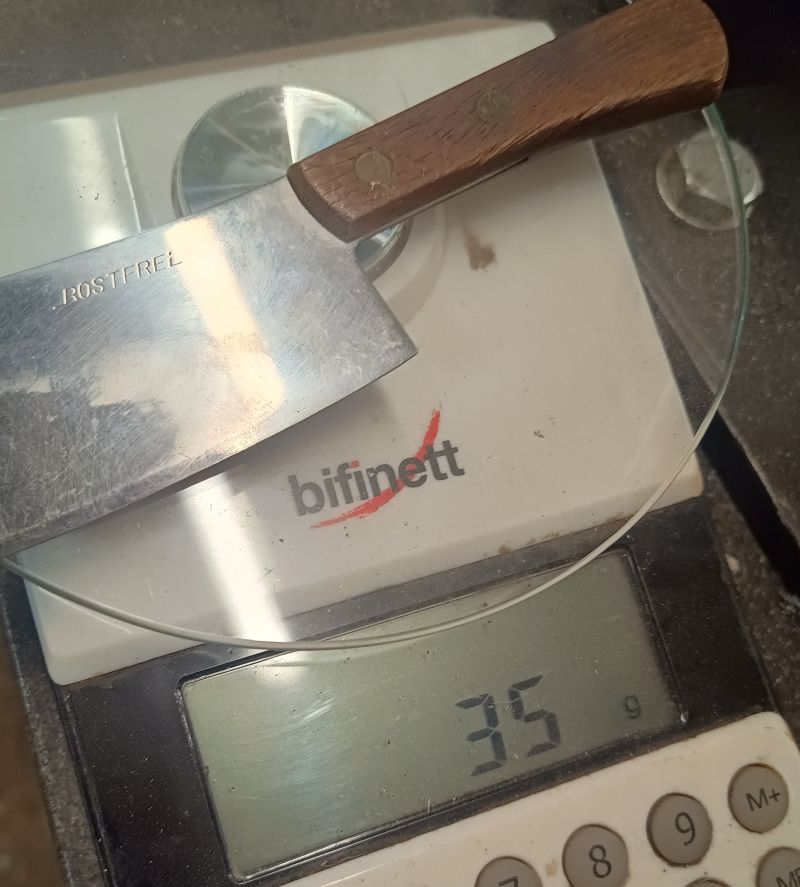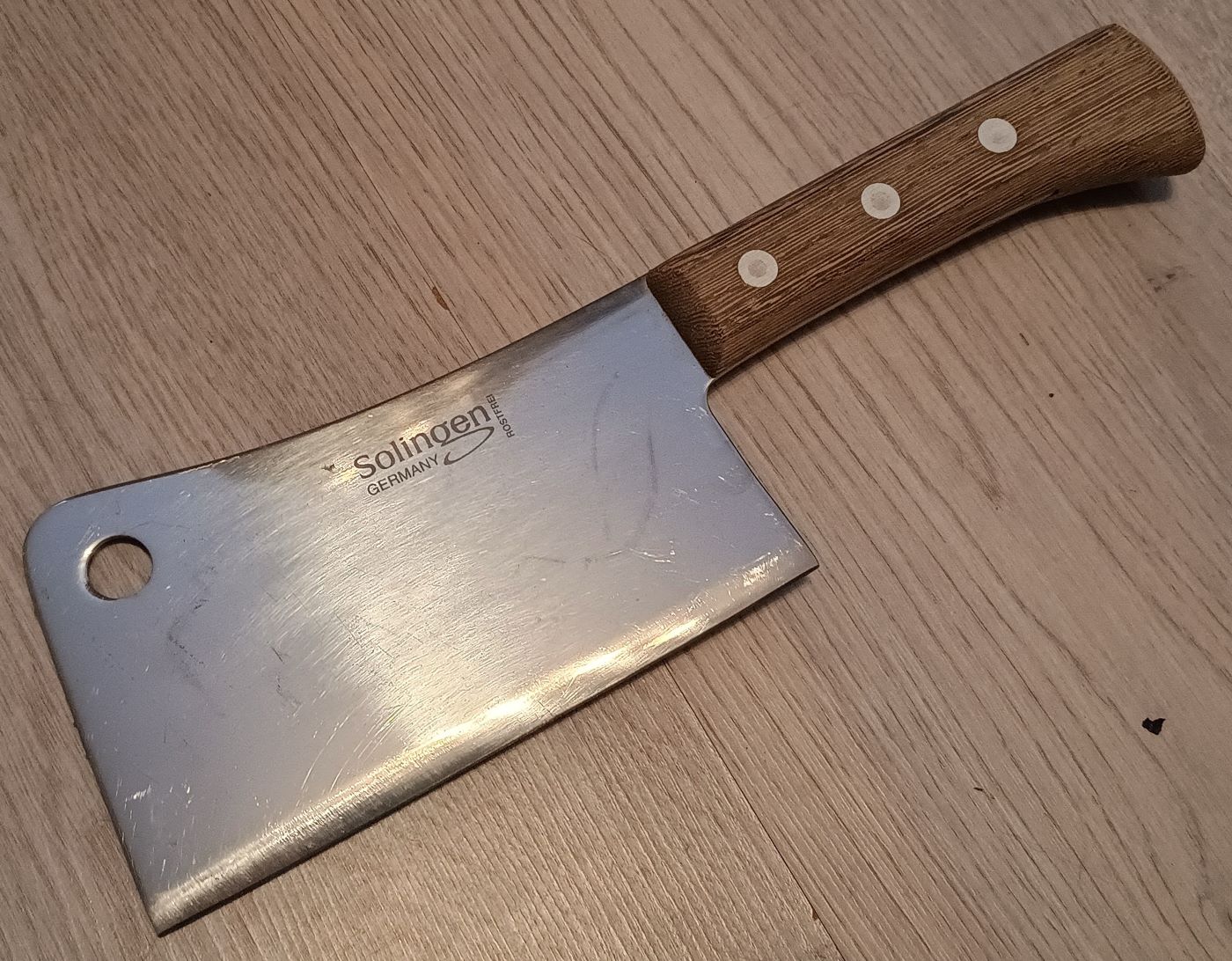 1. Das Küchenbeil aus Familienbesitz. Da mein Opa Kleintierzüchter war, wurde es oft und gerne benutzt, was man an den Nachschärfespuren erkennt. Ich habe es vor wohl 20 Jahren das letzte mal gebraucht, um Hühnerbeine abzuhacken.