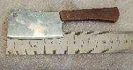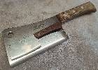 3. Das gestern von mir übernommene Küchenbeil. Hier sind Größe und Gewicht stimmig. Es wurde auch ordentlich benutzt, was die schartige Schneide und der deformierte Klingenrücken zeigt. Das Blatt hat noch Reste von einer Verchromung oder Vernickelung.