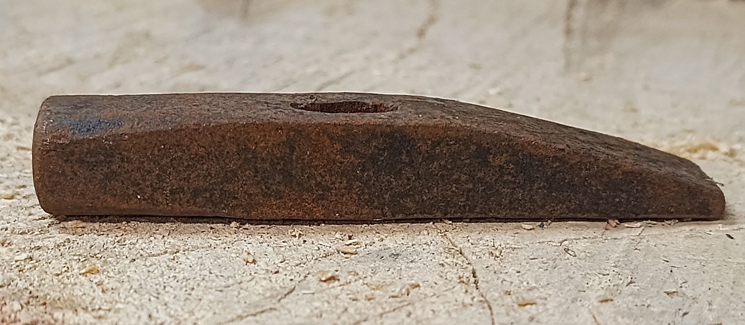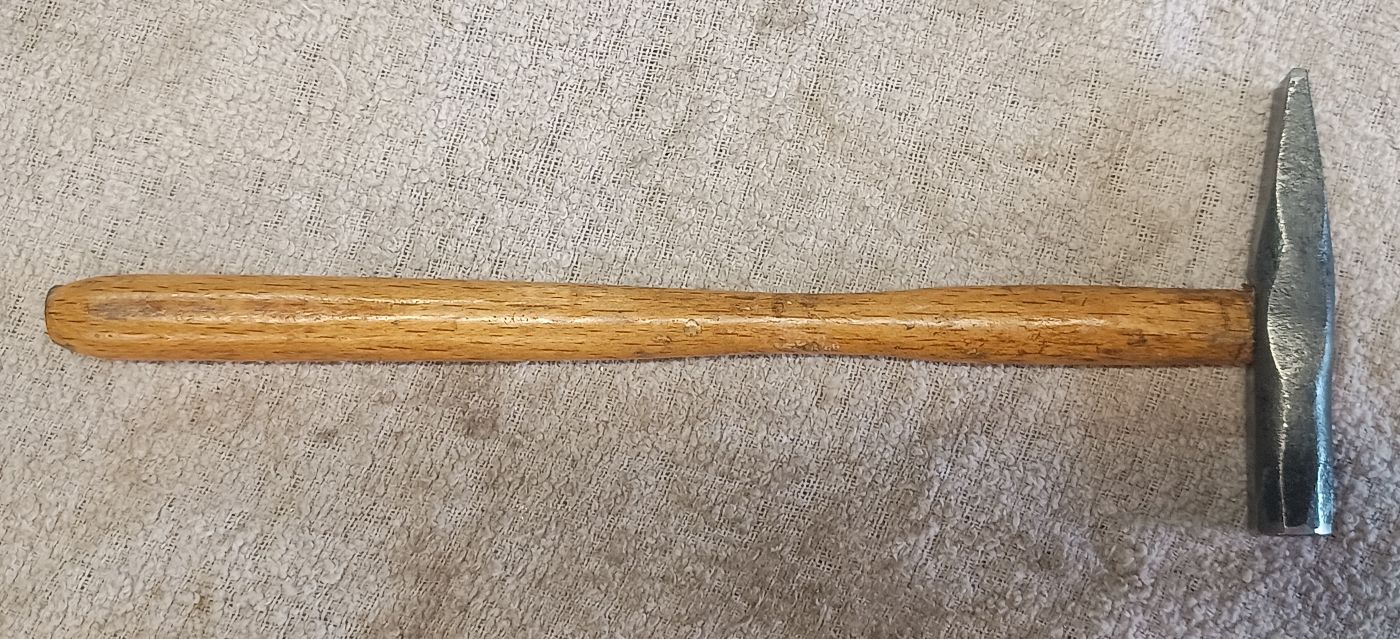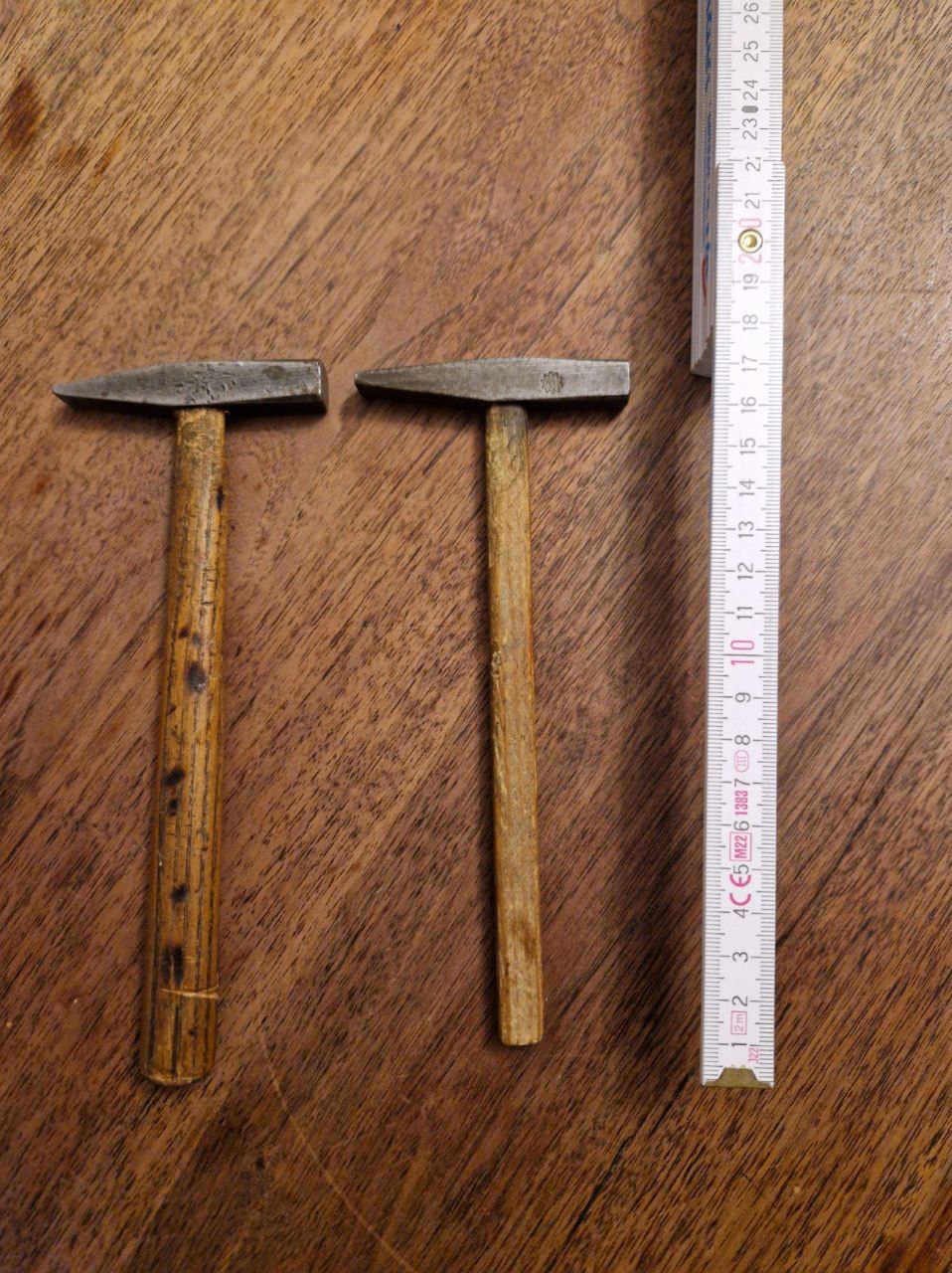 ein kleiner Dekorationshammer, genannt „Flohpeitschle“, 70 g, mit etwas ungewöhnlicher seitlicher Gußnaht. Es gibt noch kleinere für Juweliere und Uhrmacher, die ohne diese Nähte auskommen.