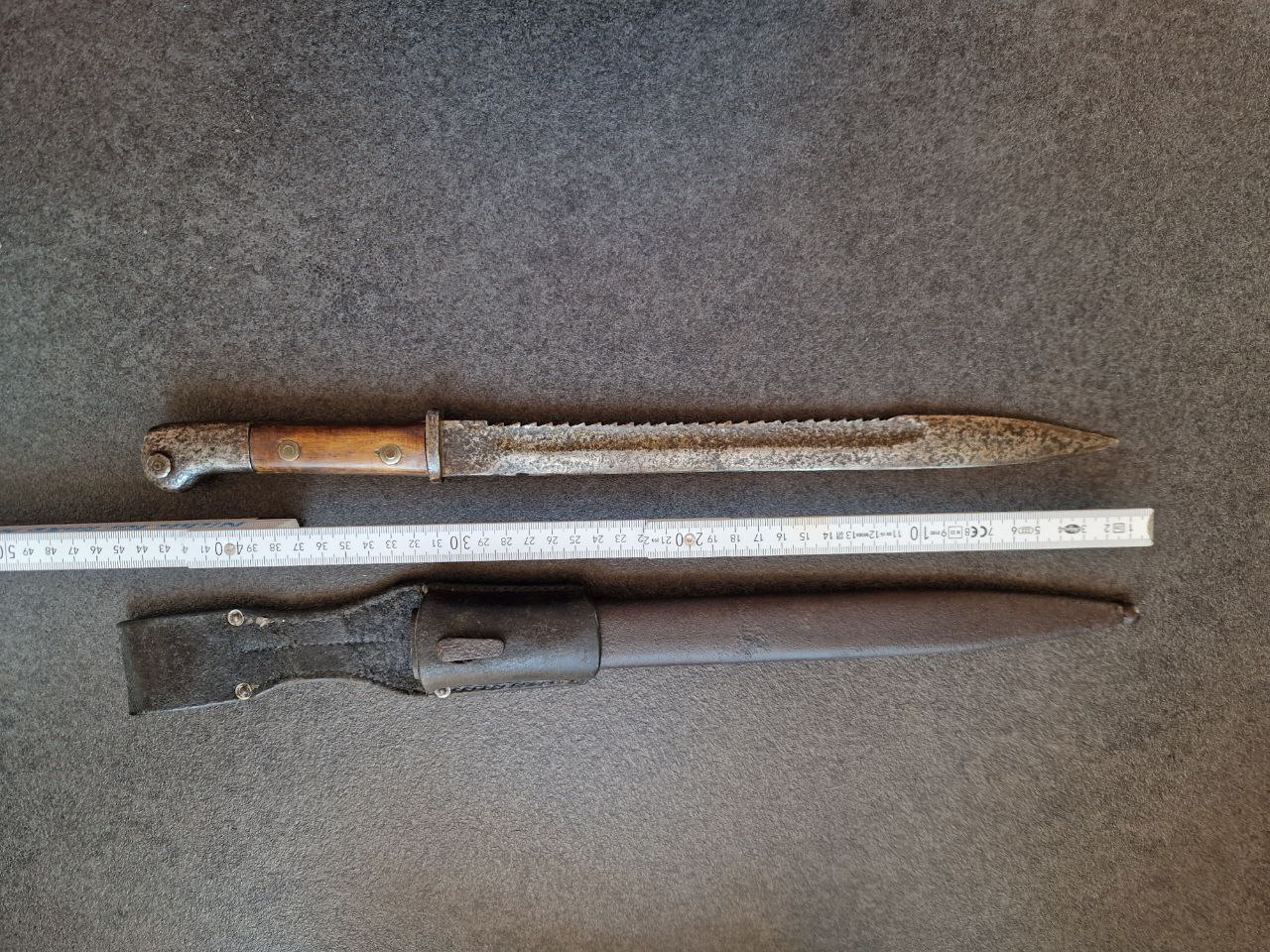 Zum Einen, es ist eine zugehörige S 14 Scheide. Zum Anderen würde ich die Abnutzung am Rand des Mundblecheinsatzes als Zeichen für eine Sägezahnklinge deuten.