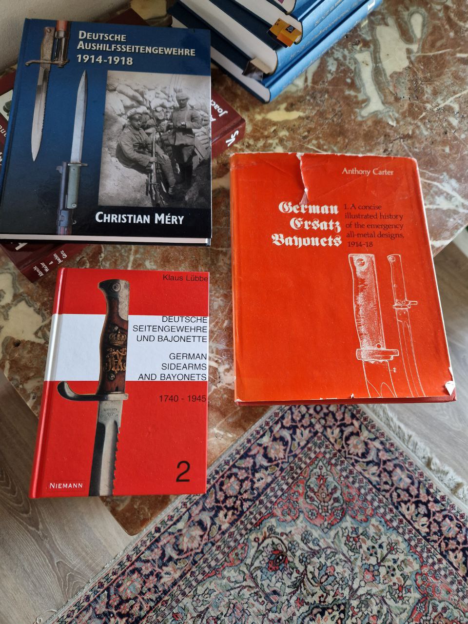Rudiger ist ein muss fuer Bajonett sammler, wenn sie in tiefe gehen wollen, Carter, Mery und Williams sind leider mehr in richtung kataloge, auch mit groben fehlern dabei, fuer anfanger gut fuer tiefe kentnisse ueber die Sache, nicht mehr besonders gut.Wichtig was fuer fokus ist bei der Sammlerei? welche periode welches Land welche Bajonette?, leider sind die Ersatz und 1WK Sachen nicht besonders gut beschrieben.