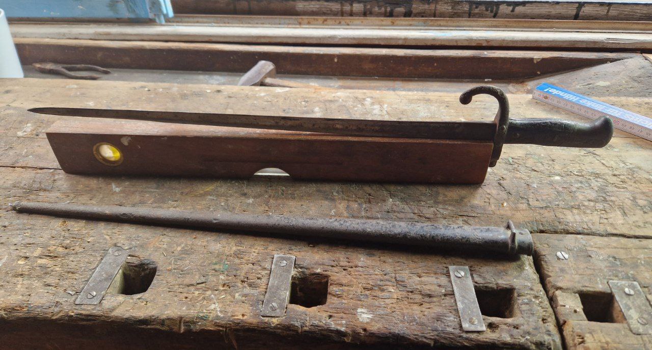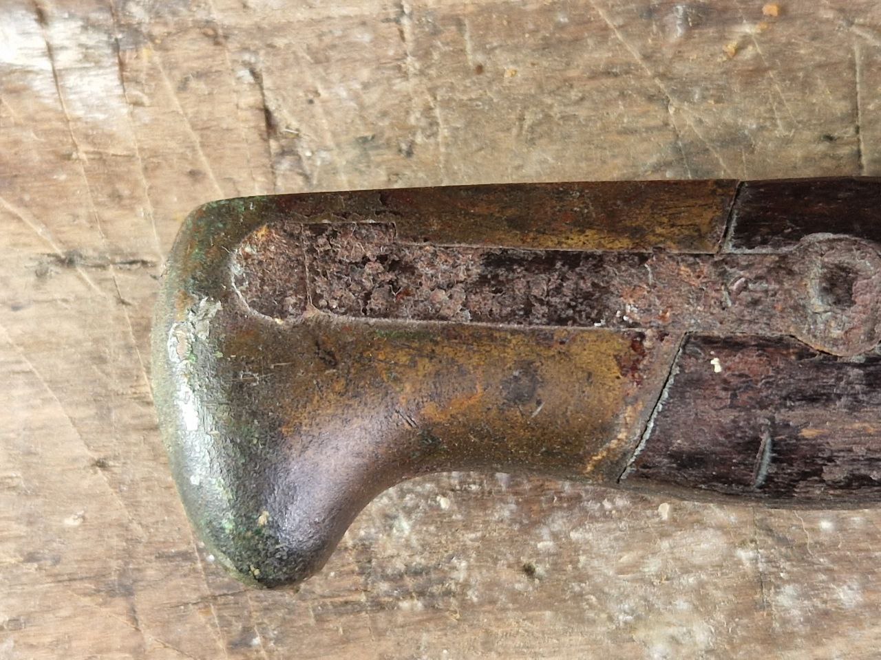 ich nehme als Beispielsfall dieses Aushilfsseitengewehr (EB 118). Diese Fotos stammen aus dem Fundzustand und danach habe ich es angesichts des stark verrosteten festsitzenden Drückers mit Nähmaschinenöl "konserviert". Meine „Tat“ habe ich eigentlich sofort bereut, da es eben jetzt nicht mehr aussieht, wie „frisch“ aus dem Dachboden gezogen.