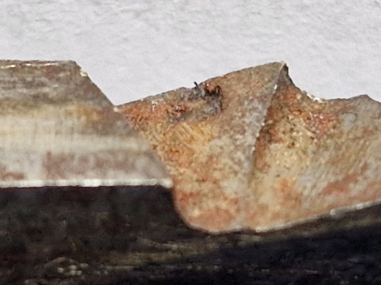 Bild 6, 7 und 8 Aufnahmen vom Klingenrücken,insbesondere Bild 8 eine tiefere Rostnarbe auf dem ersten Zahn.