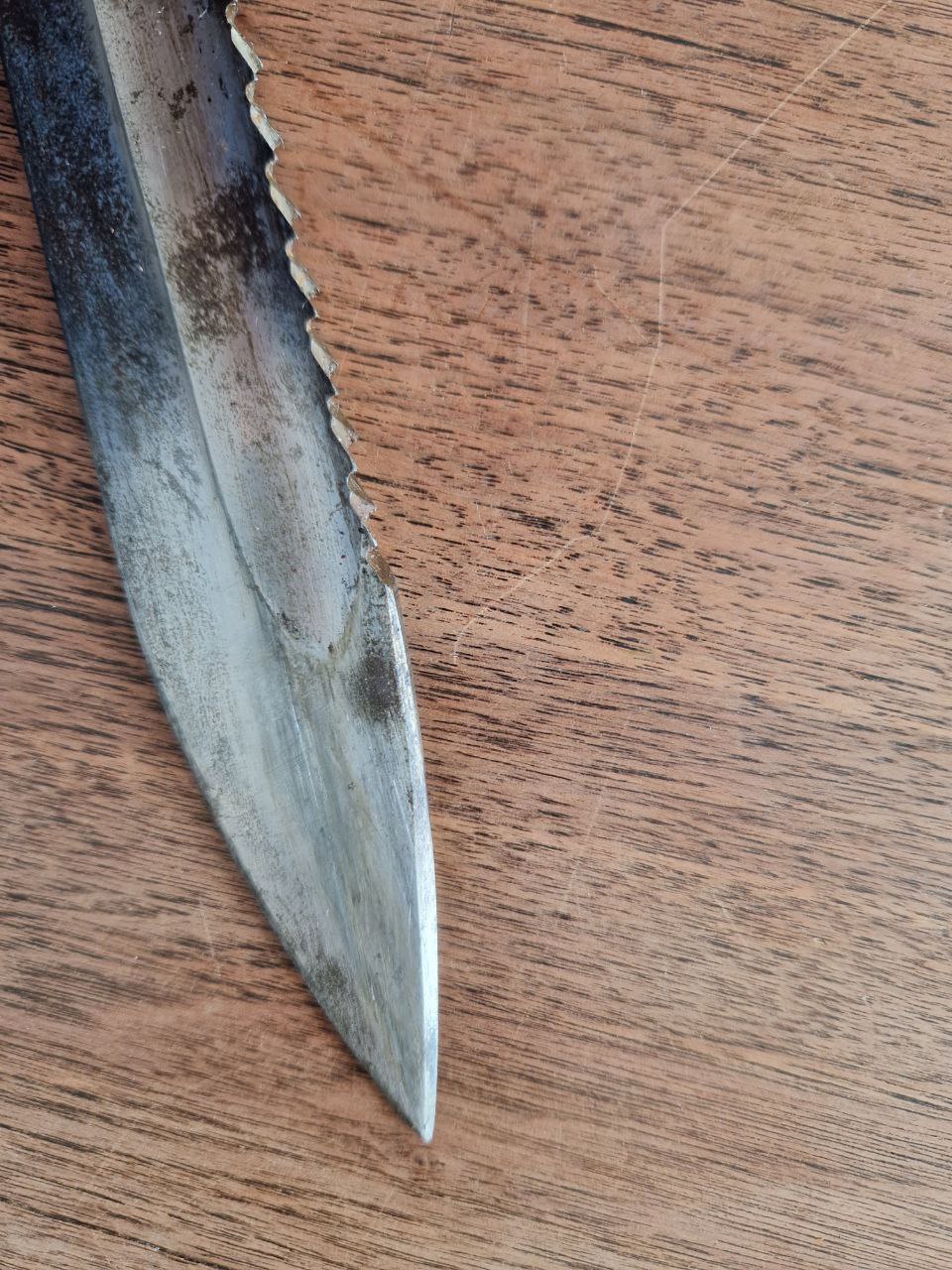 2. Das Stück sieht zwar ziemlich mitgenommen aus, ist aber noch ziemlich scharf geschliffen. Daher auch die Bilder 11, 12 und 13: Ich habe das Stück als "feldmäßig angeschliffen" erworben. Der Rost auf den geschliffen Kanten wirkt so alt wie auf dem Rest vom Stück. Aber das muss ja nichts bedeuten. Ich habe das Stück so fotografiert, dass die geschliffenen Kanten sich spiegeln und damit erkennbar sind. Gibt es sowas wie "feldmäßig" geschliffen? - in meiner Literatur habe ich dazu nichts gefunden (habe aber weiß Gott noch lange nicht alle Bücher durchgelesen). Der Klingenrücken ist so ca. 2cm zur Spitze hin geschliffen.