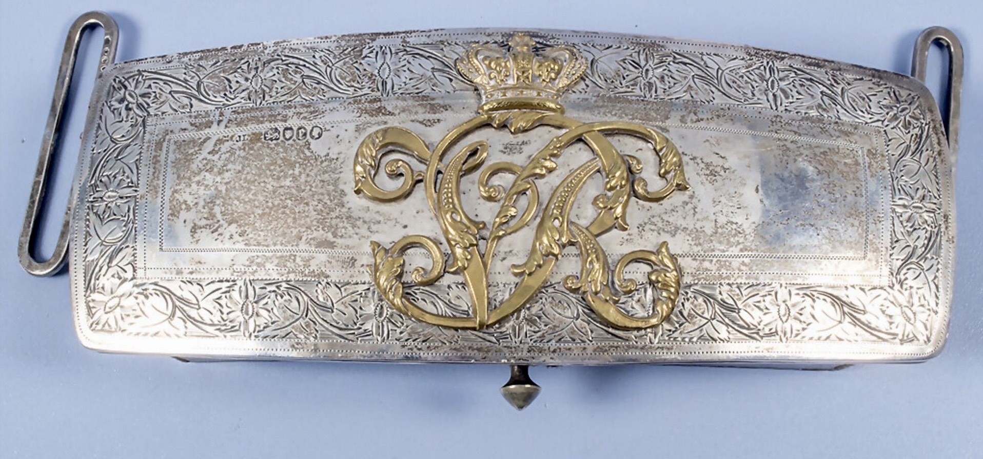 Zum Verkauf steht ein Kartuschkasten für englische Kavallerie-Offiziere aus dem Jahr 1860. Der Deckel und die Trageösen sind aus Silber gefertigt uns sind mit Punzen aus London gestempelt. Die fünf Marken lassen sich folgendermaßen auflösen: 1.)Leopardenkopf steht für London 2.)der „schreitende Löwe“ für den Feingehalt des Silbers 3.)der Kopf von Queen Victoria als Steuermarke 4.) das gotische kleine „e“ ist der Datumsbuchstabe für das Jahr 1860 und 5.) die Herstellermarke des Silberschmieds John Lilly („JL“) der seit 1851 in London als Silberschmied registriert war. Der Kartuschkasten ist im gutem, getragenen Zustand. Der kleine Verschlußriemen auf der Unterseite ist leider gerissen.