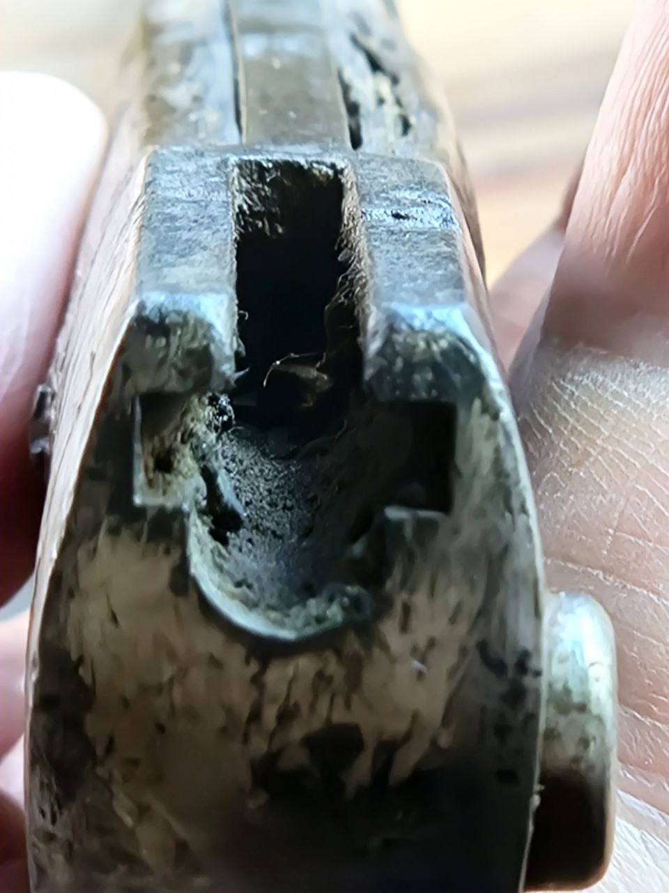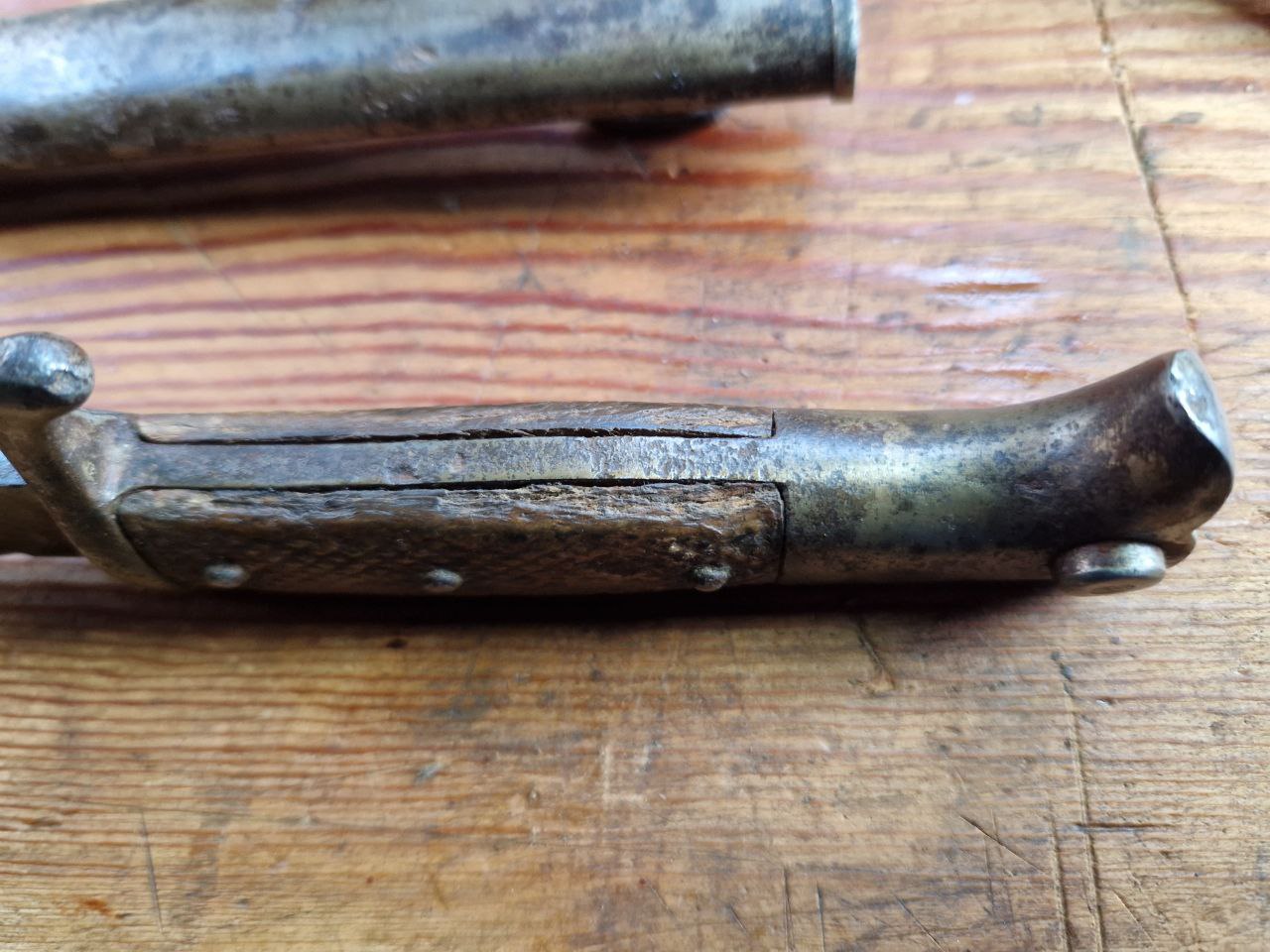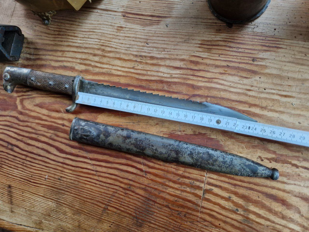 Nachfolgend kommen dann noch Bilder von der Säge und dem Scheidenmund. Ich halte das Stück entgegen den Verkäuferangaben für ein authentisches Eigentumsseitengewehr aus dem oben genannten Zeitraum, was auch meinem Sammelgebiet zeitlich entsprechen würde, aber ich bin freilich kein Fachmann, sondern ein Anfänger. Daher bin ich jetzt gespannt, was die Fachleute sagen.
