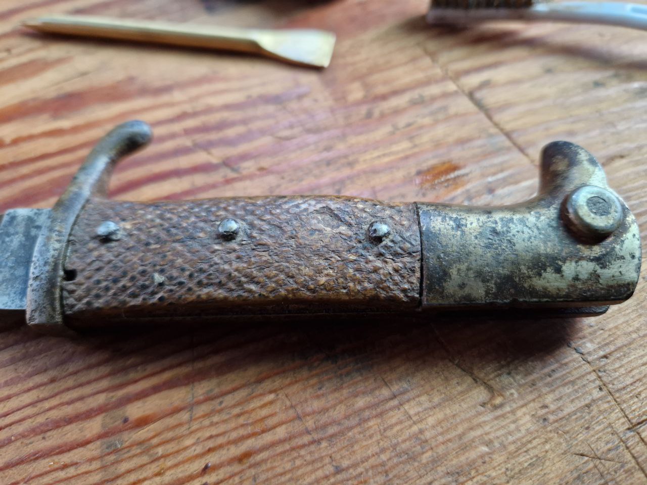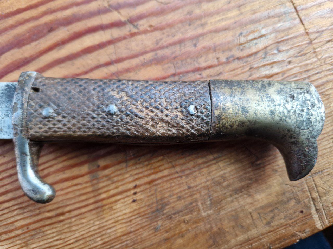 dieses Seitengewehr habe ich als "Pionier Seitengewehr K98, Säge, Einrast gängig. um 1938" erworben. Nach meiner Vermutung handelt es sich aber um ein Eigentumsseitengewehr aus dem Zeitraum um den ersten WK nach dem Muster des kurzen SG 98: Das SG besitzt mit drei Nieten genietete gepresste Ledergriffschalen (Bild 3 bis 7), eine Eisenmontierung (Rostnarben Bild 8) und ein interessantes Herstellerlogo von