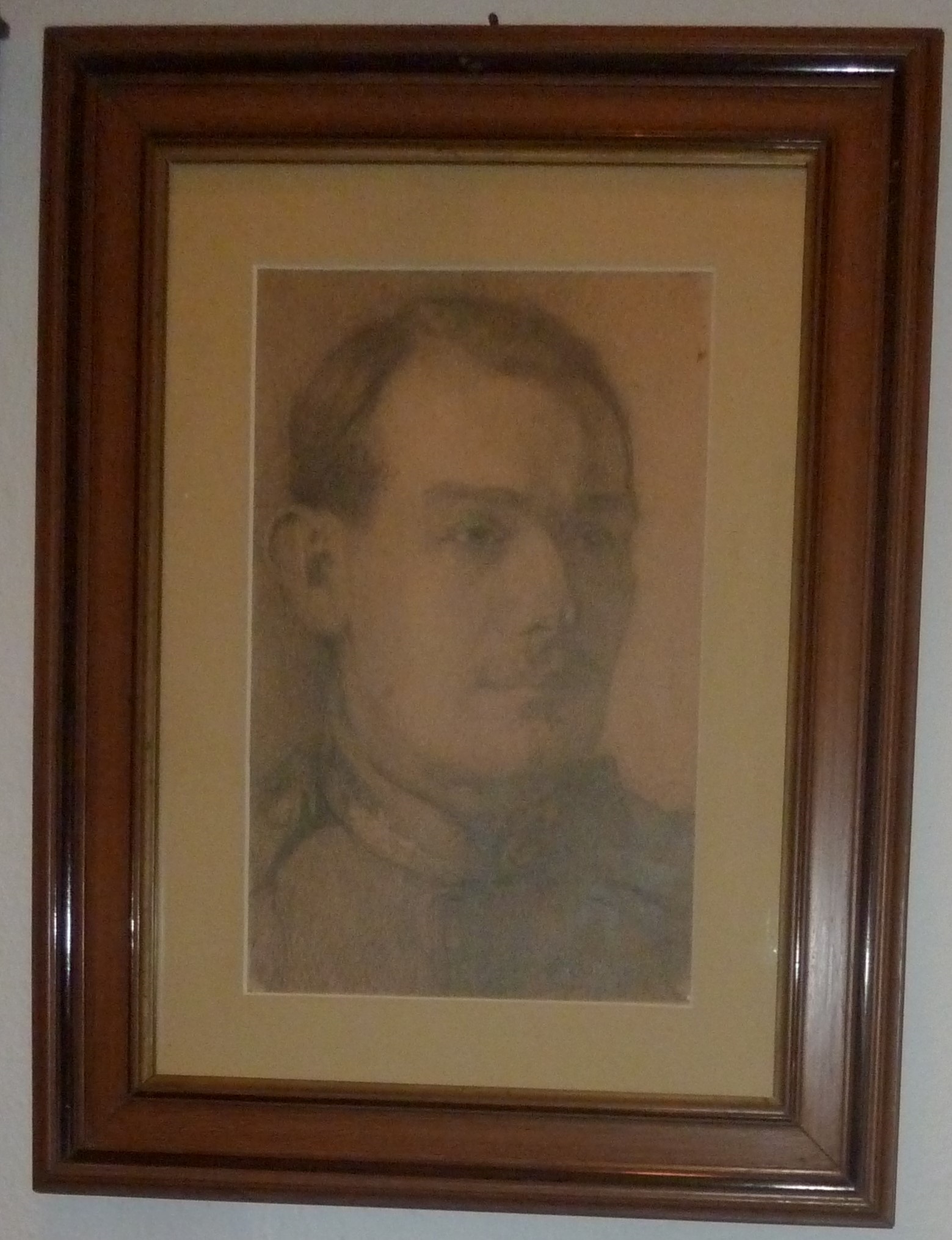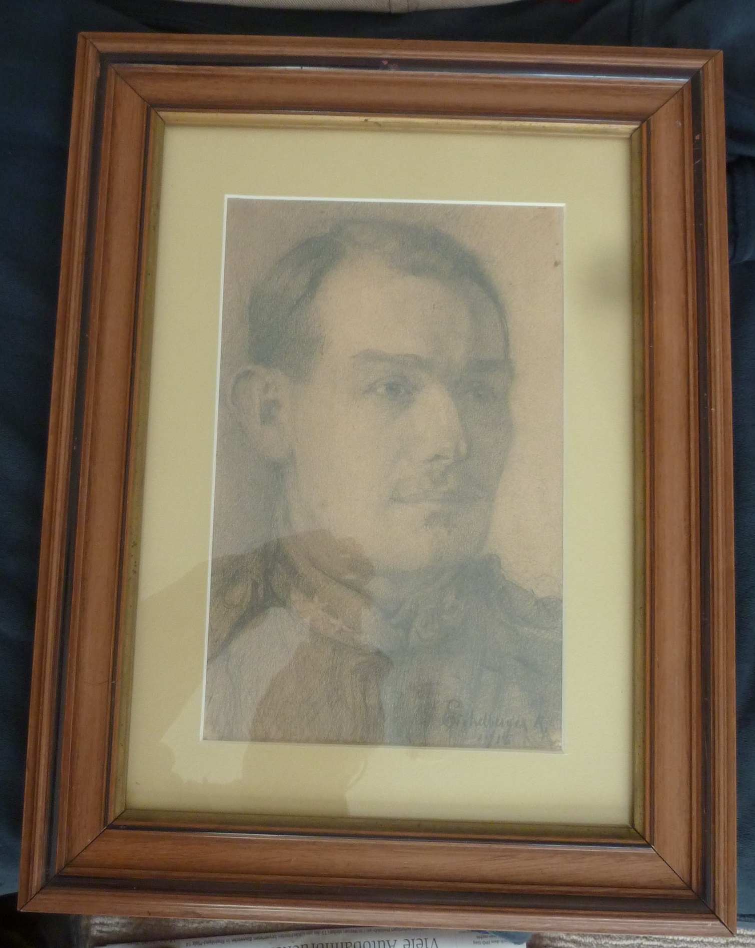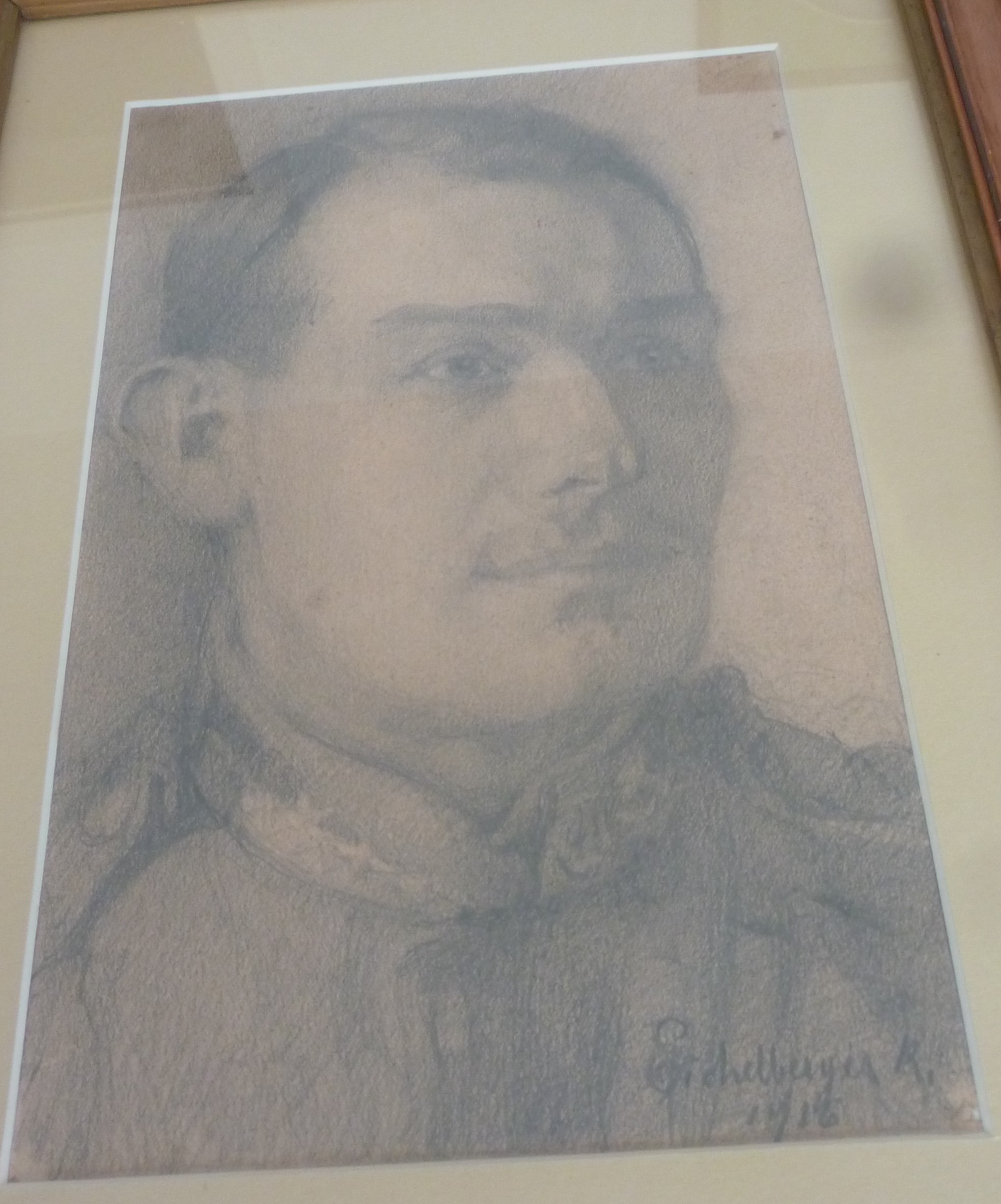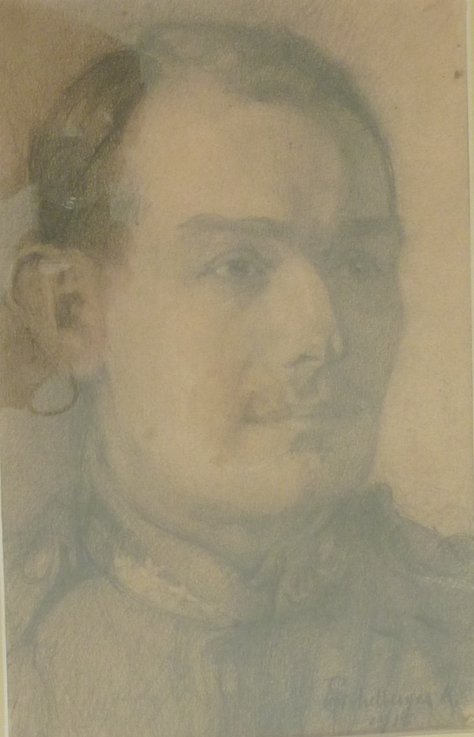Nun zum Bild selbst: Dargestellt ist ein junger Mann in Uniform. Die Bleistifftzeichnung ist äußerst qualitätvoll ausgeführt. Unten rechts auf dem Blatt (ziemlich grobes Papier übrigens, eher feldlagermäßig als ateliermäßig) befindet sich der Name "Eichelberger R." und das Datum "1916". Leider kann ich die Uniform nicht zuordnen, allerdings gab es nach meinen Recherchen einen Robert L. Eichelberger, der 1916 Oberleutnant der US-Streitkräfte war und es später zum General gebracht hat (