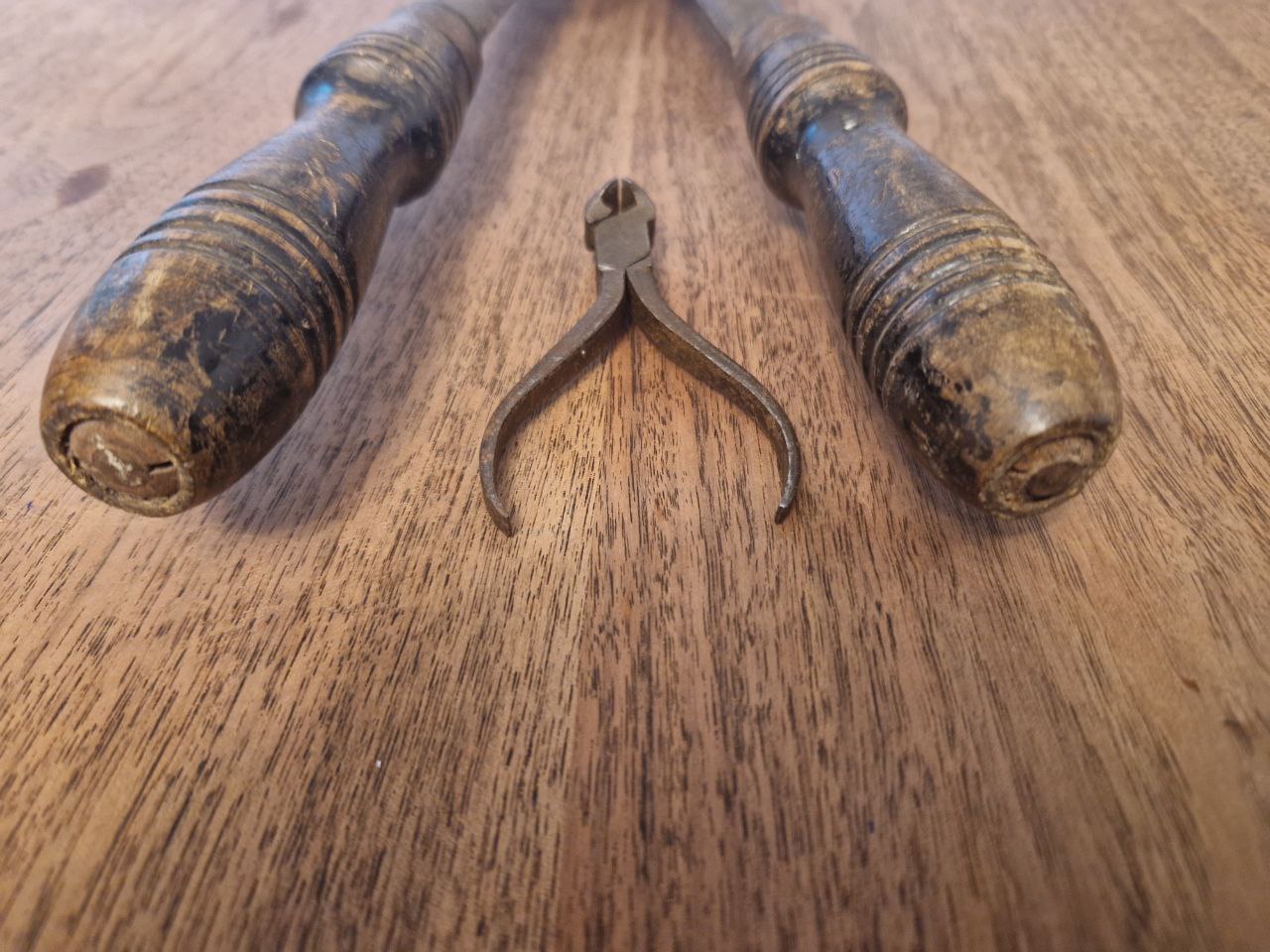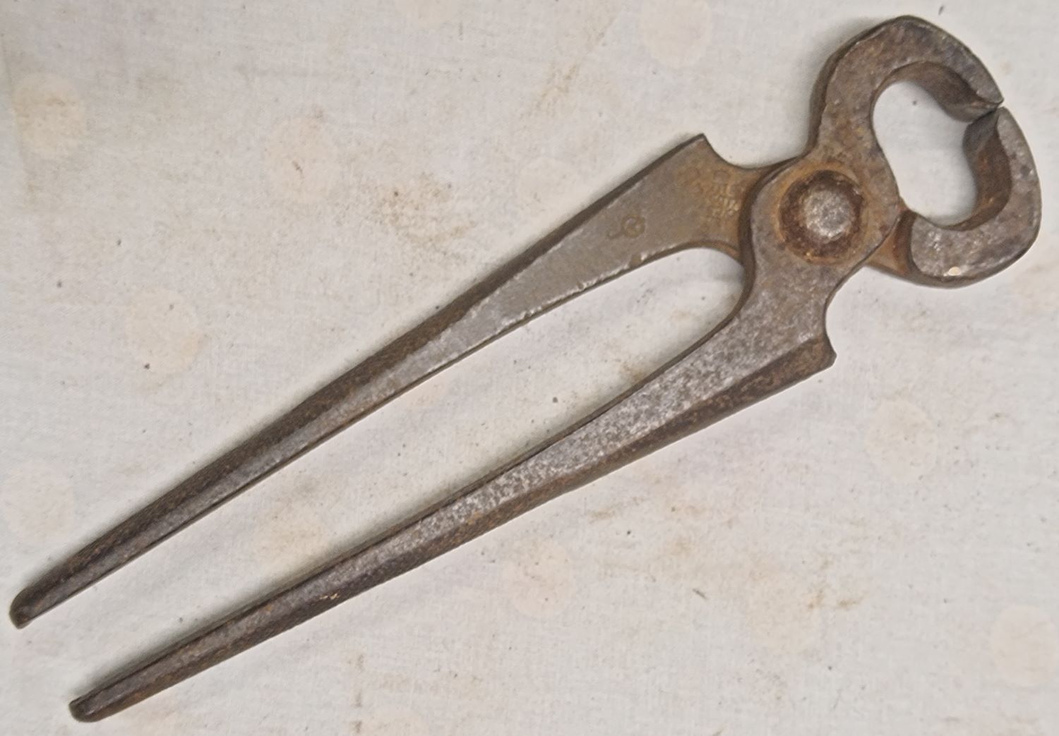 Eventuell lehne ich mich zu weit aus dem Fenster, aber die große Zange, Ferdinand, würde ich, aufgrund der Bauart, in den Bereich Hufzangen verorten. Ist aber nur eine Vermutung.