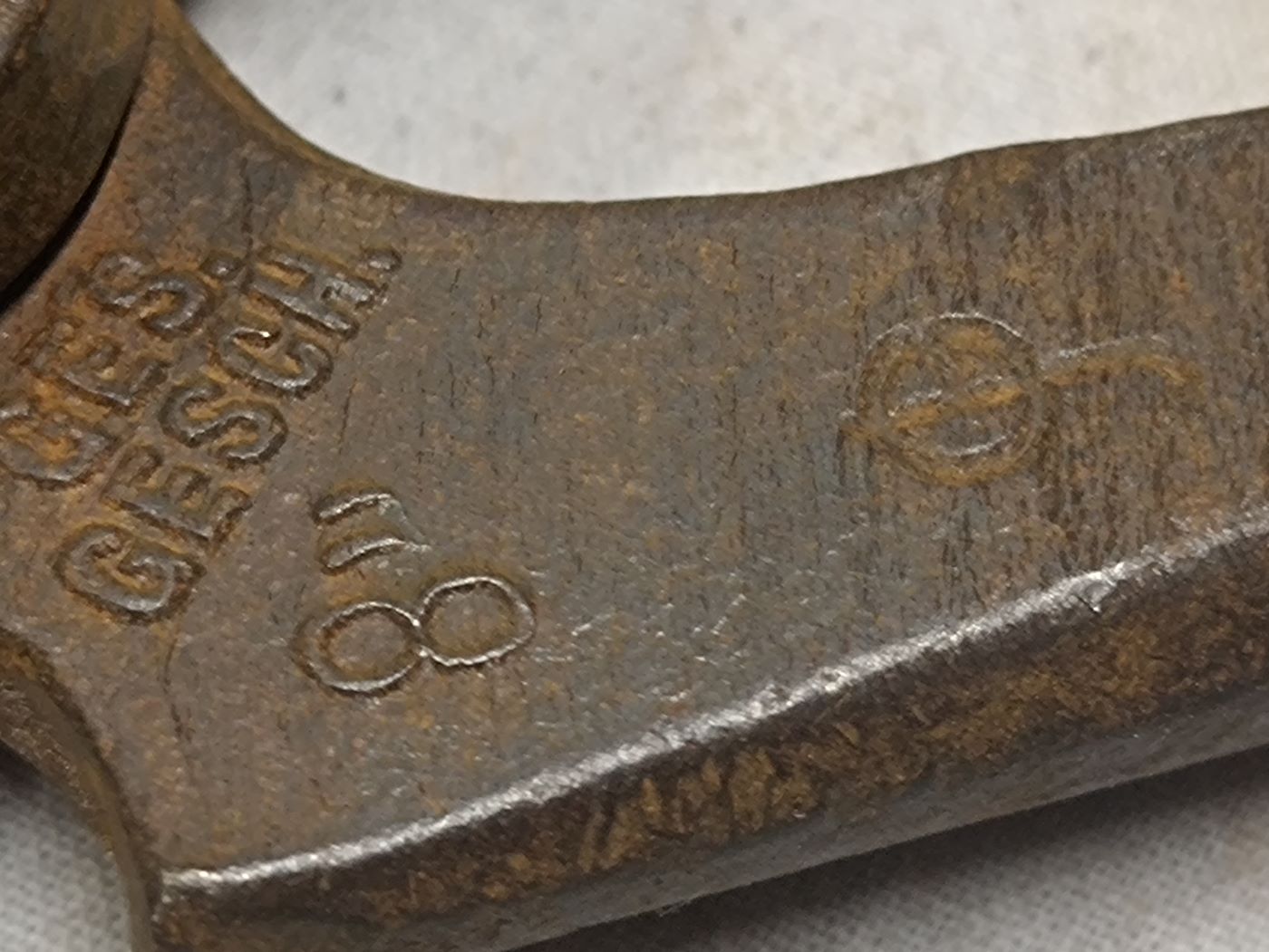 Hier mein aktueller Flohmarktfund mit Markierungen. Der Hersteller scheint mit "CGP" Carl Gustav Putsch zu sein, der 1882 eine kleine Schmiede für Zangen gründete. Die Firma existiert unter dem Namen "Knipex" bis heute.
