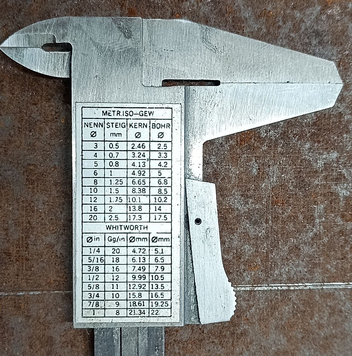 Weitere Aufschriften sind STAINLESS HARDENED und rückseitig eine Tabelle mit Angaben zu metrischen und Whitworth Gewinde.