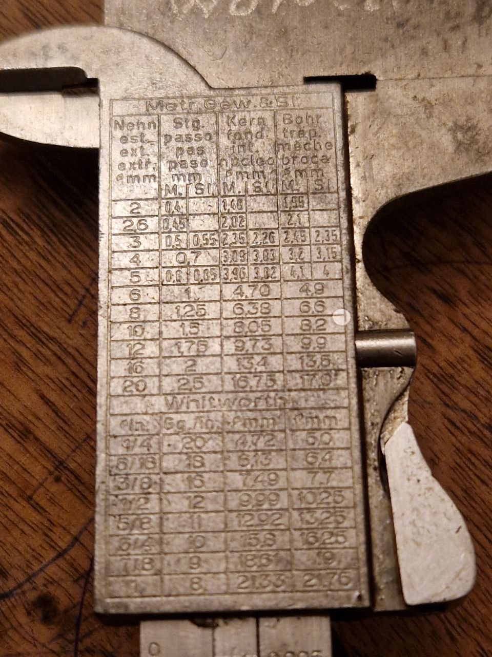 Weitere Aufschriften sind STAINLESS HARDENED und rückseitig eine Tabelle mit Angaben zu metrischen und Whitworth Gewinde.