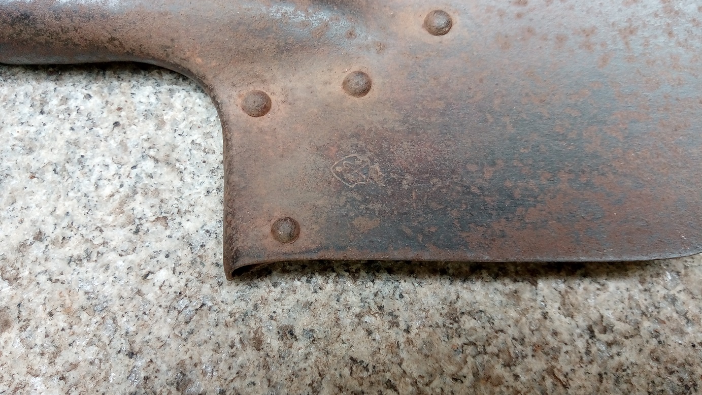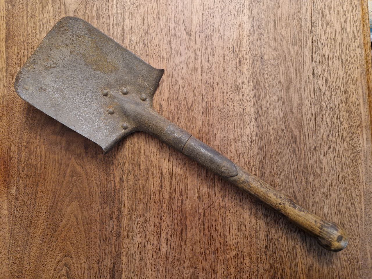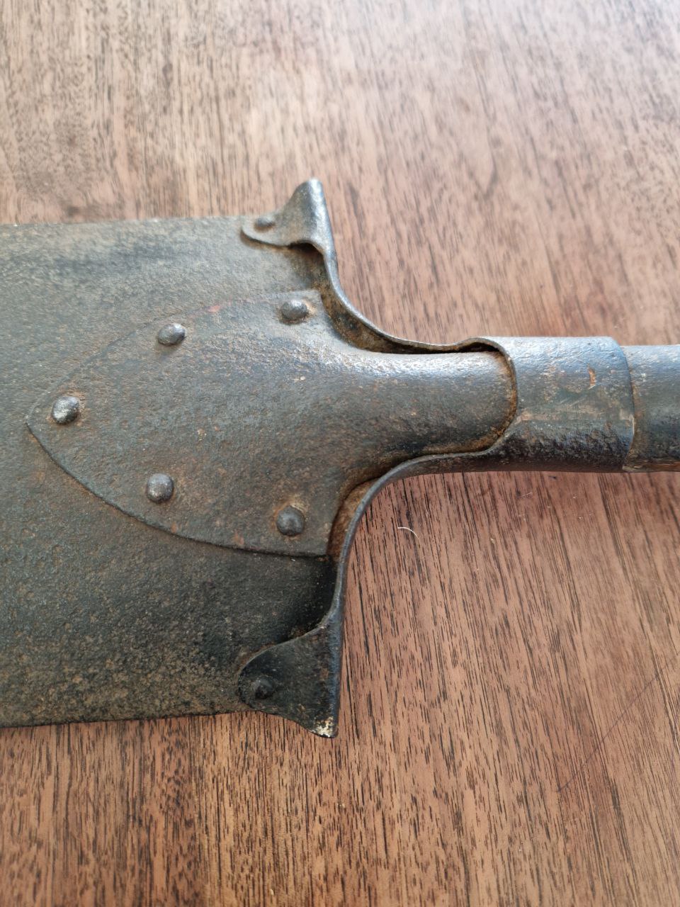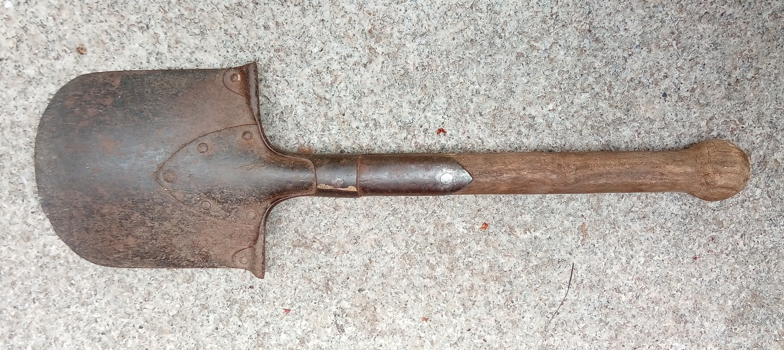 Die Tage bei einem Bekannten im Gartengeräteschuppen nach einem Schäufelchen gesucht um Frühlingsblüherzwiebeln einzugraben und gefunden: Einen Feldspaten M1898! Den habe ich gleich mal fotografiert und er hat sogar noch einen Herstellerstempel!