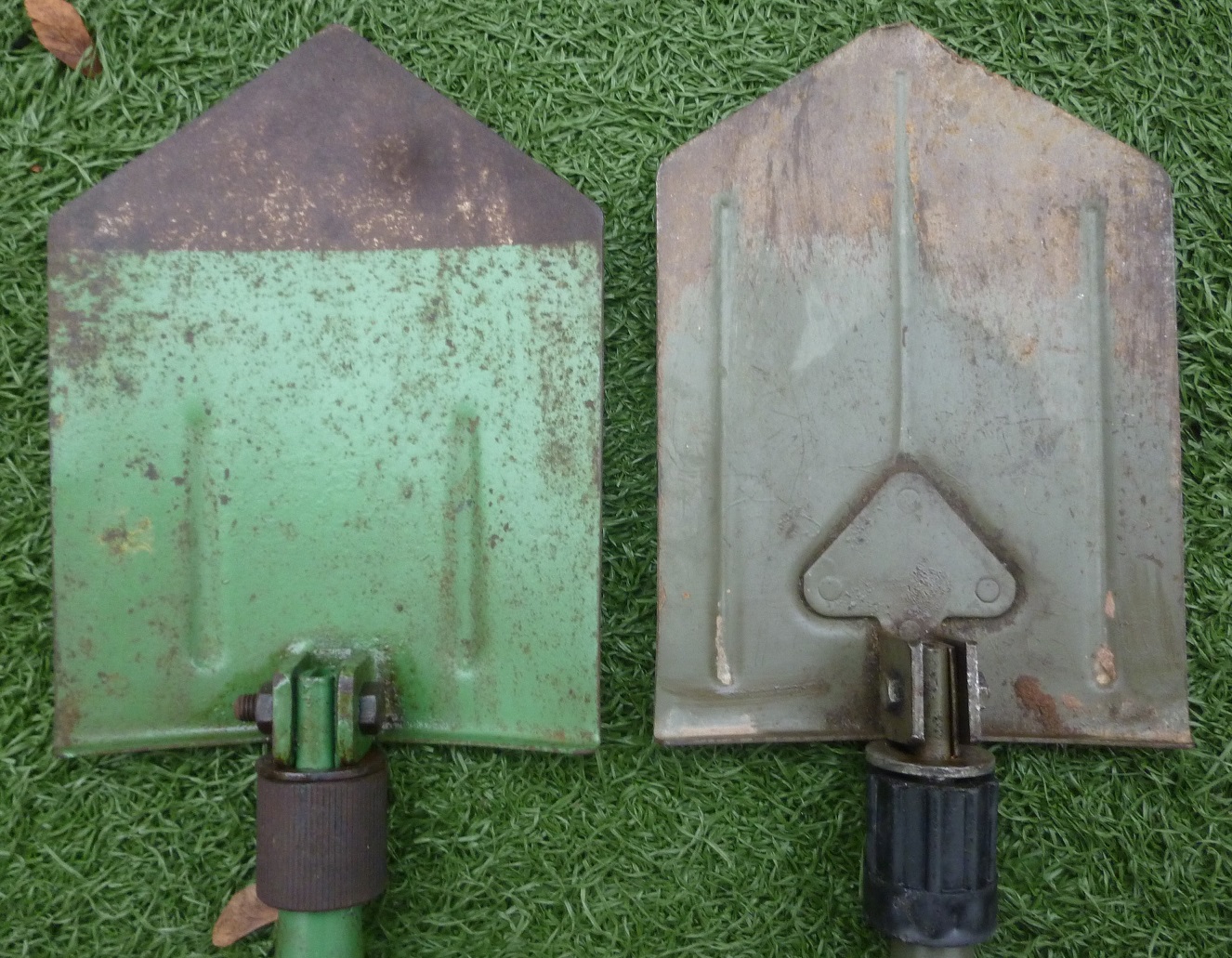 Habe hier auch noch zwei Klappspaten im Bestand. Der hellgrüne ist wohl zivil und funktioniert noch gut (kein Hersteller ersichtlich); ich verwende ihn allerdings recht selten. Da ist halt ein richtiger Spaten schon ein anderes Kaliber.