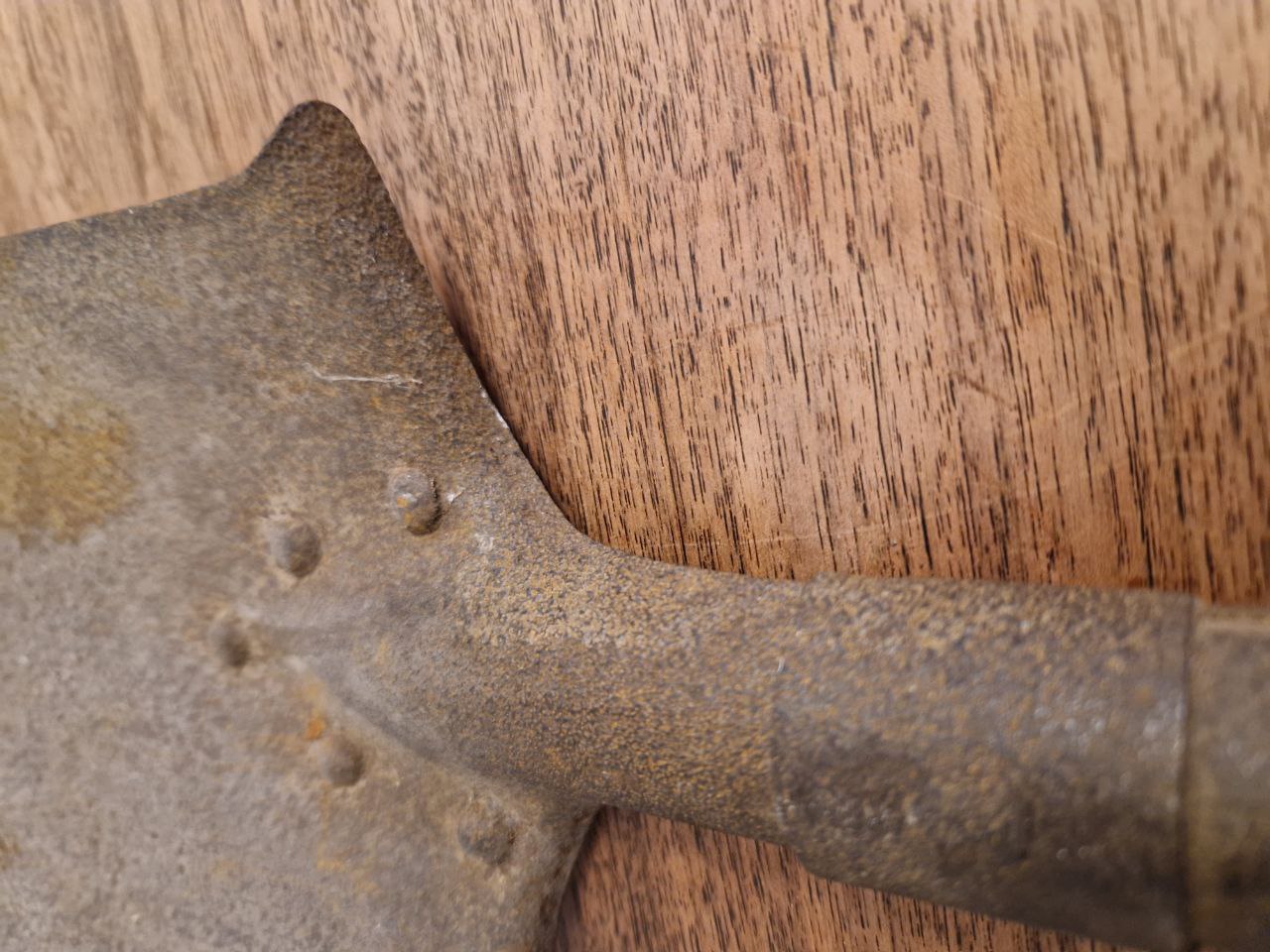 Ein Bundeswehr-Klappspaten. Ich nenne ihn mal ein universelles Grab- und Verteidigungswerkzeug. Ungeliebt in der Werkstattecke hinter einer meiner Werkbänke. Diesen Klappspaten habe ich vor mindestens zwei Jahrzehnten mal angeschafft, weil ich auch mal Sondeln gehen wollte. Da das im Land Brandenburg aber nicht erlaubt ist und das Sondeln auf dem eigenen Grundstück nicht mein Ziel war, habe ich die Sonde längst wieder weggegeben. Den Spaten habe ich aber noch behalten. Noch, denn den brauche ich auch nicht. Nur noch für eines, ihm demnächst Pflege angedeihen zu lassen, wo ich ihn schon mal herausgekramt habe.