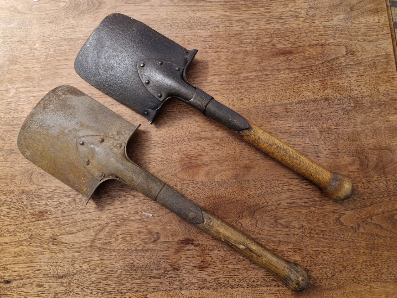 Hier nun ein Feldspaten M98, also mit verstärkter Trittkante. Er ist insgesamt 52,7 cm lang und am Spatenblatt an der Trittkante 15,4 cm breit. Am Ende habe ich zum Vergleich ein SG 98/05 zum Größenvergleich hinzugelegt.