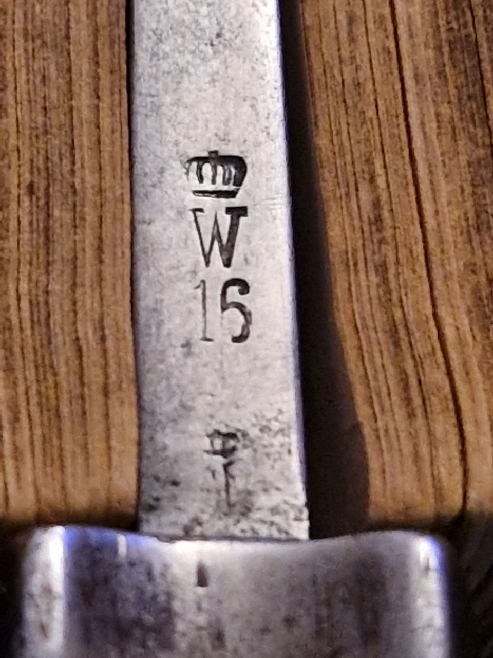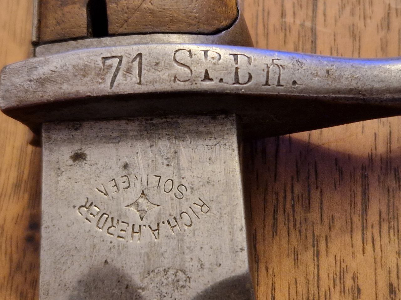 ich habe dieses Seitengewehr 98/05 W 16 mit den Stempelungen auf der Parierstange "1920" und "71 SP.Bn.", sowie mit einer V-Kerbe am Knauf erworben. Also ein Stück das wohl in der weimarer Republik eine Weiterverwendung bei der Schutzpolizei gefunden haben könnte.