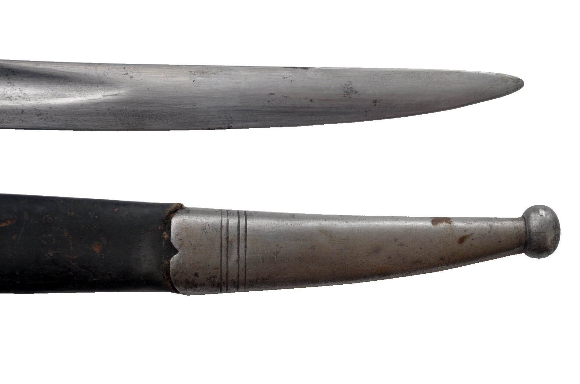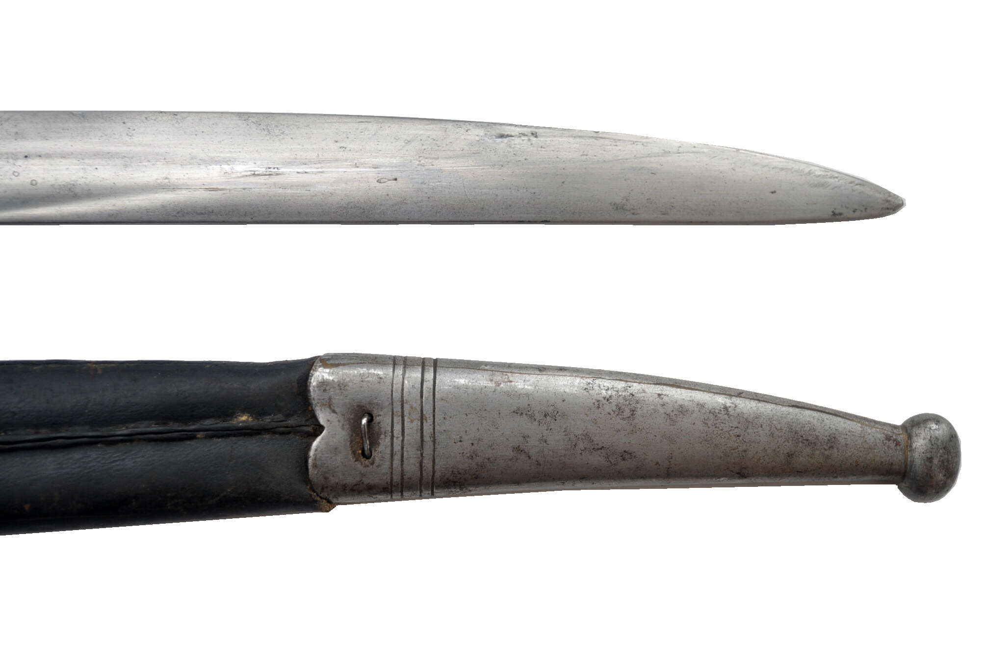 schwarze Lederscheide mit Stahlblechbeschlägen, rückseitig verdrahtet, Ortknopf