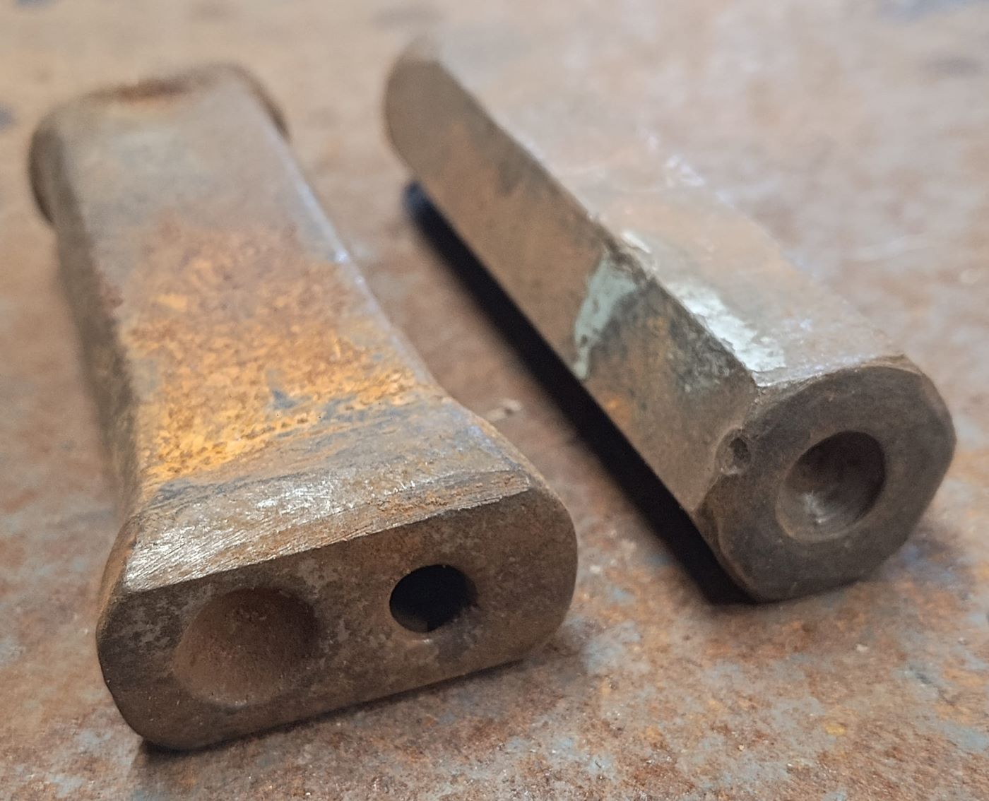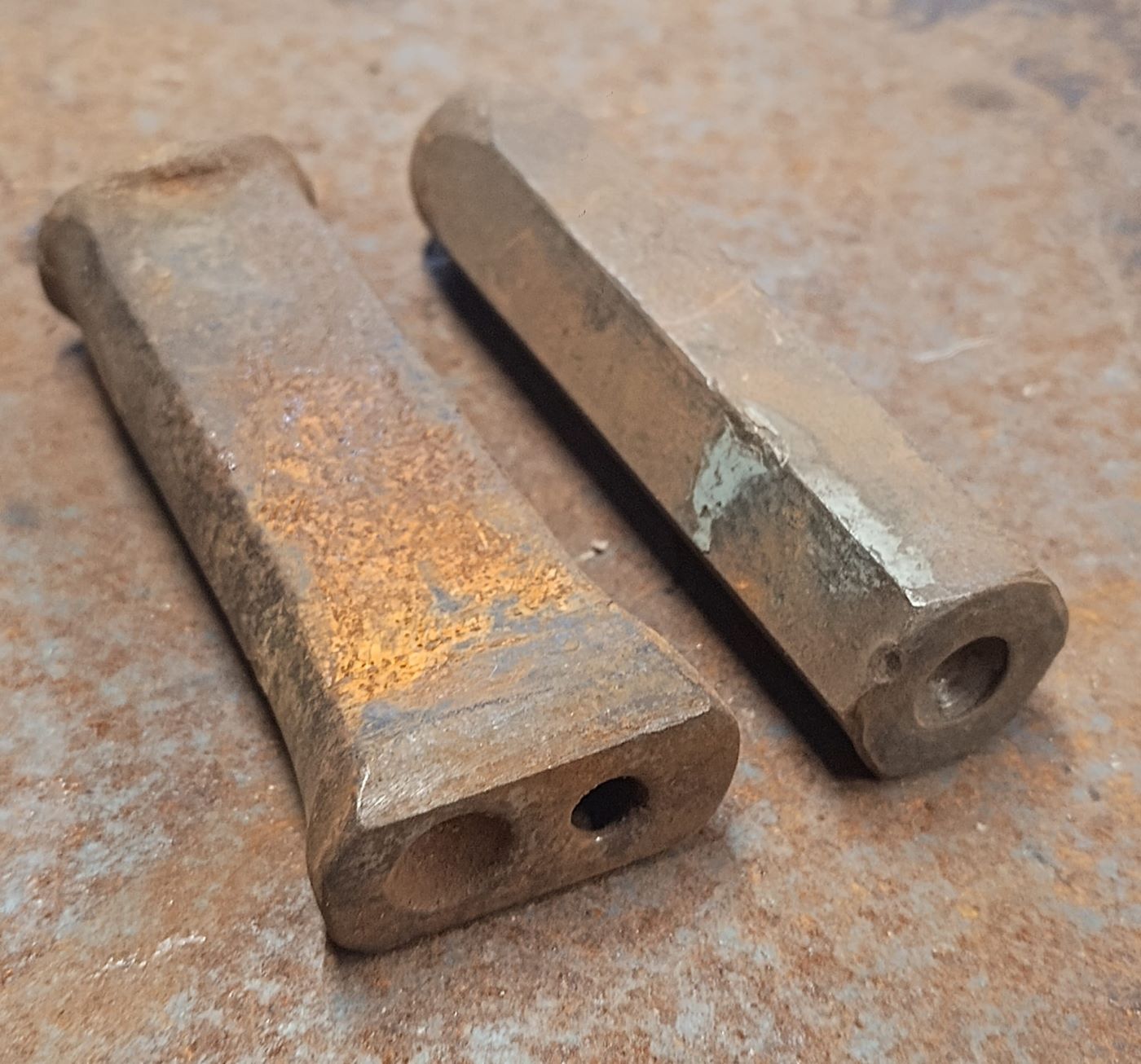 Diese beiden Teile habe ich letztes Wochenende beim Trödler gefunden. Es handelt sich um Werkzeuge zum Vernieten. Wobei das rechteckige Teil eine Kombination von Nietenzieher (zum "Anziehen"/Andrücken der Bleche an den schon vorhandenen Nietkopf) und Vernieter ist.