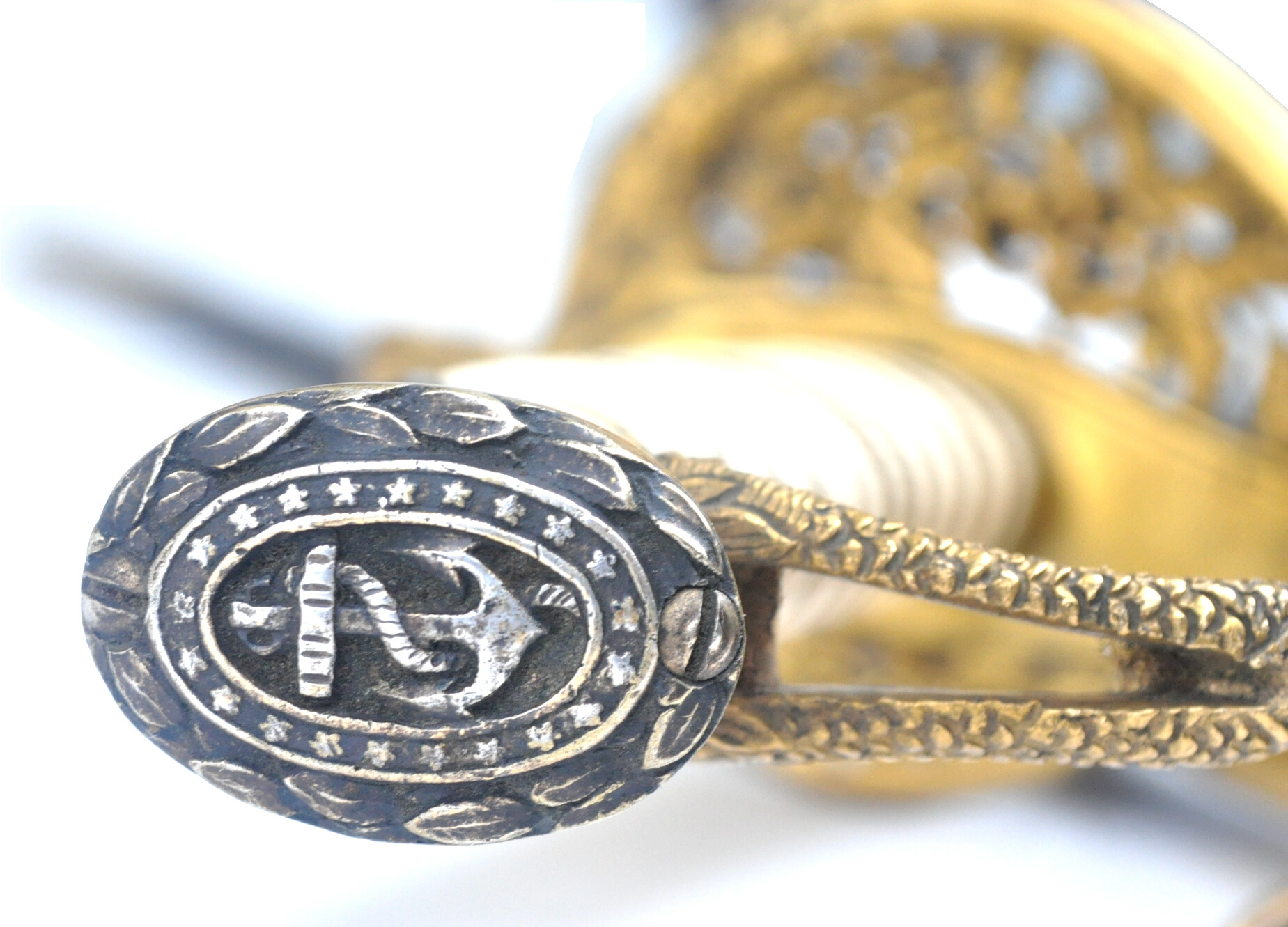 halbe Griffkappe mit Lorberranken, auf dem Knauf unklarer Anker im Sternenoval
