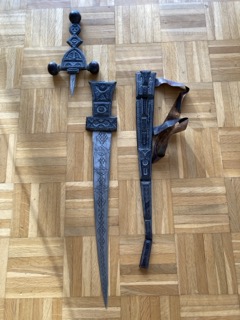 zusätzlich gibt es noch ein kleineres Messer in der Scheide, Länge der Klinge 15cm, sie sitzt an der Scheide / Ober- bzw. Vorderseite.