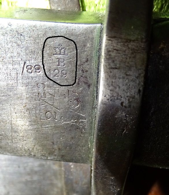 Als Hersteller ist gerade noch zu erkennen P.D. Lüneschloss, Solingen (Bild5), auf der anderen Seite dachte ich immer, das ein Anker zu erkennen sei (Bild 6). Ich glaube aber mittlerweile, das es eine Engliche Abnahmemarke ist (siehe zum Vergleich Bild 7 von einem P1976 für Martini Henry). Gestempelt ist es auf der Rückseite des Griffs mit 3728 (Bild 3). Bild 4 ist das P1856. Bis jetzt war die Vermutung, das es sich um ein Marine Bajo für das kurze Enfield handelt. Eine andere Vermutung wurde mal geäußert, das es sich um ein Bajo handelt, das an eine Partei des Amerikanischen Bürgerkriegs geliefert wurde. Da spricht aber eigentlich die Abnahmemarke dagegen, wenn es eine ist.