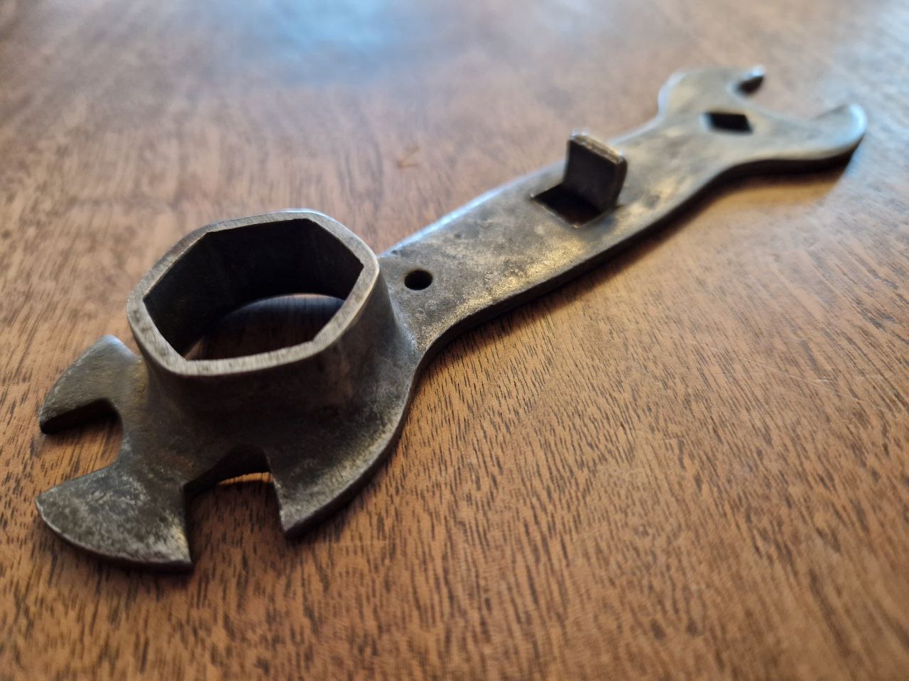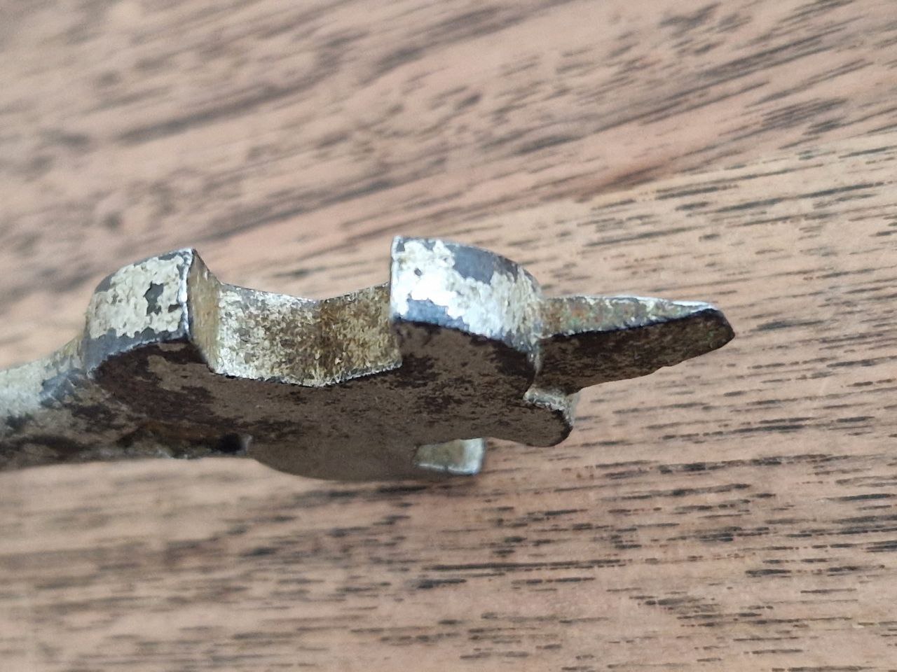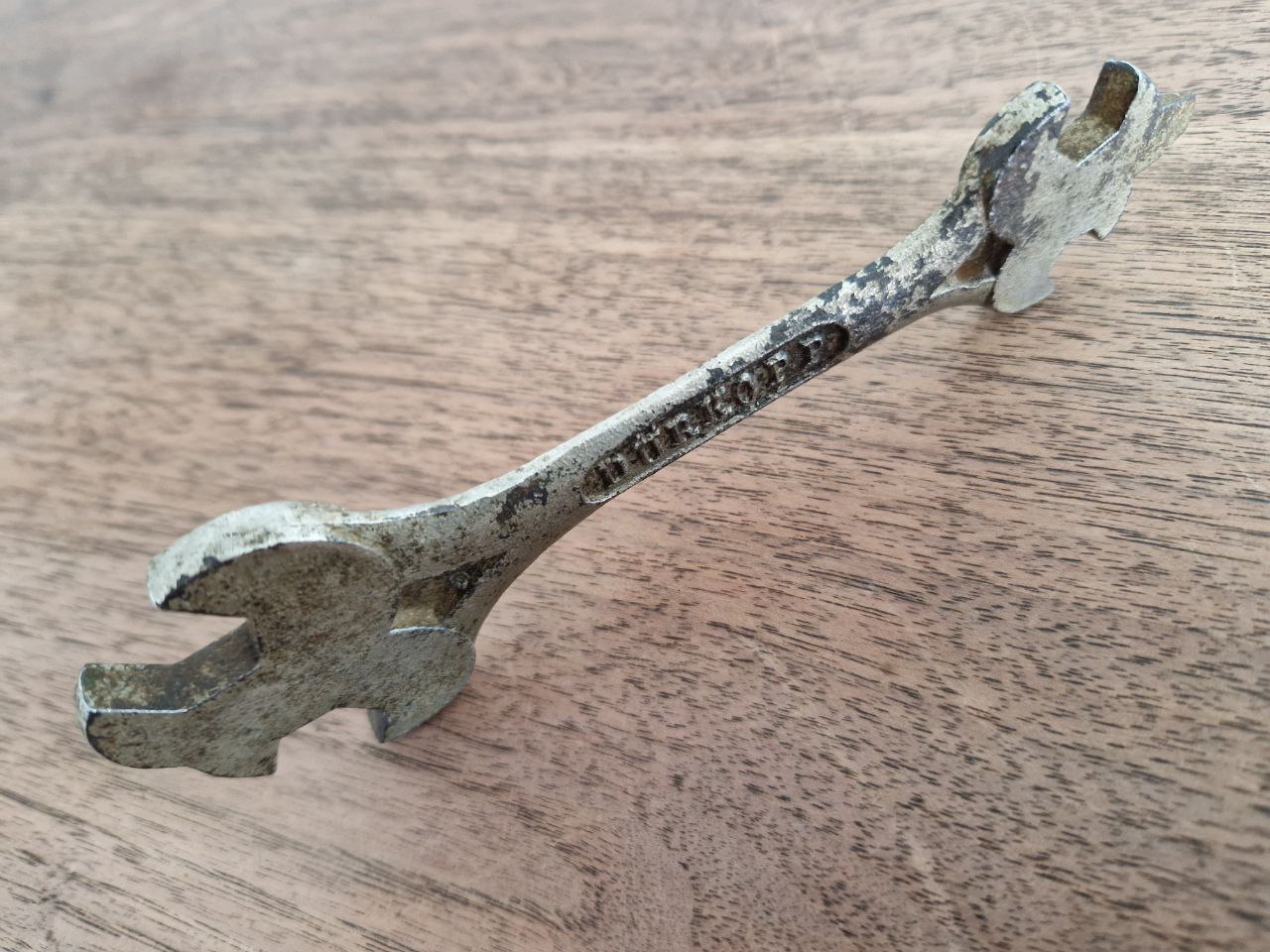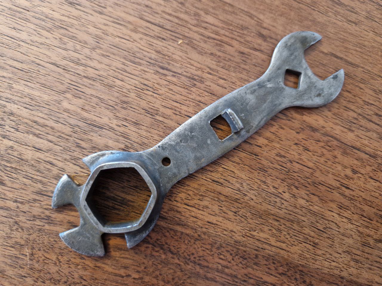 Der Schlüssel zeigt noch Reste seiner ursprünglichen Verchromung/Vernickelung und besitzt neben den vier Maulschlüsseln auch eine Schraubendreherfunktion. Das Loch sieht nachträglich gebohrt aus.
