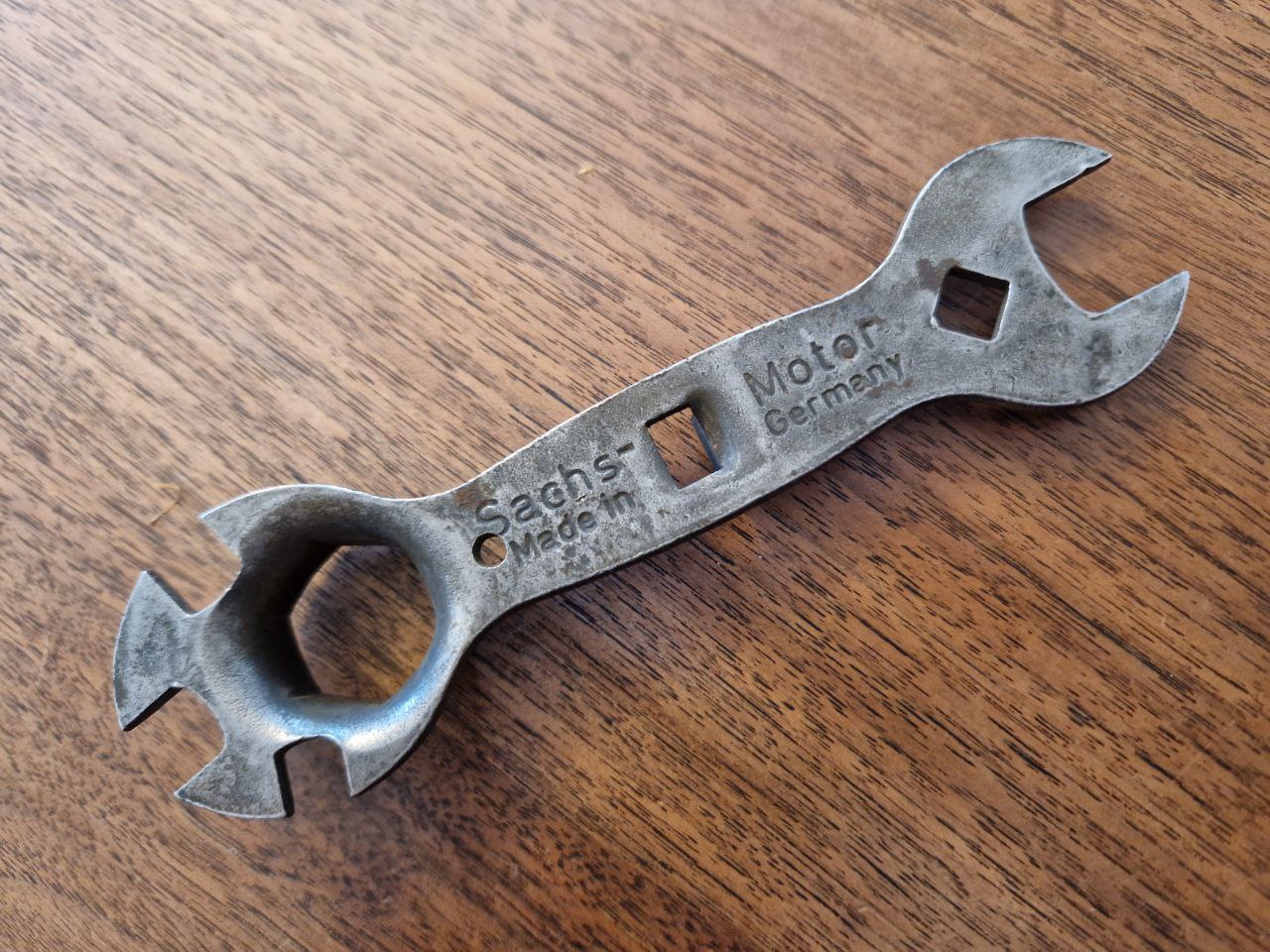 Zu welchem Motor dieser 99 Gramm schwere und 150 mm lange Schlüssel gehört, konnte ich nicht ermitteln – man findet diese Stücke noch sehr häufig auf Flohmärkten. Er trägt die Aufschrift: „Sachs – Motor“ und „Made in Germany“. Die Kennzeichnung „Made in Germany“ gibt es übrigens schon sehr lange: Am 23. August 1887 hatte Großbritannien mit dem sogenannten Merchandise Marks Act eine Kennzeichnung ausländischer Produkte festgelegt, um die Briten insbesondere vor den deutschen Billigprodukten zu warnen, welche den britischen Markt überschwemmten. Jahrzehnte später wandelte sich dieser ursprüngliche „Verbraucherwarnhinweis“ zu einem weltweit geschätztem Gütesiegel für hohe Qualität und Präzision.