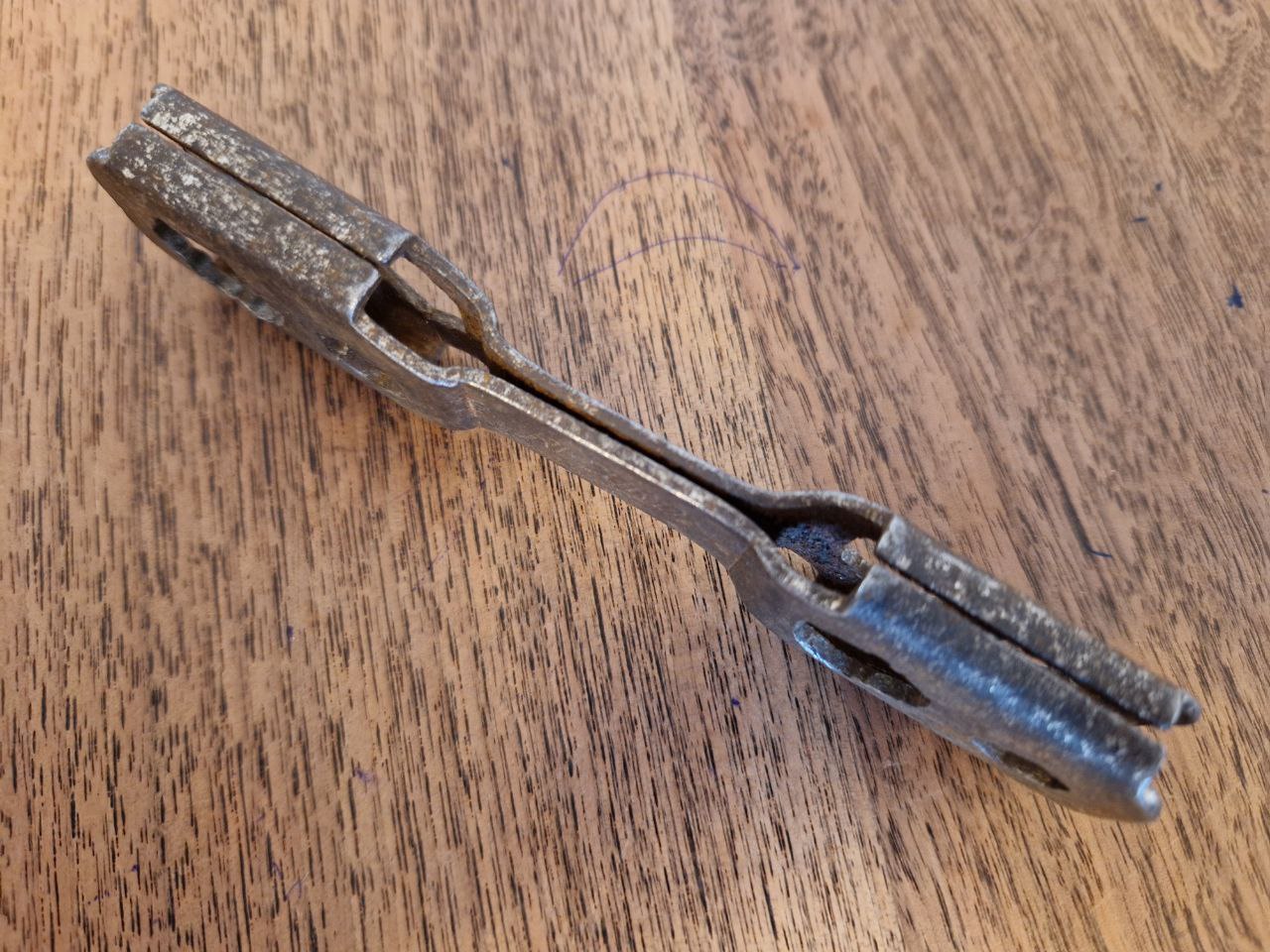 Seine starken Nutzungsspuren zeugen einen fleißigen Gebrauch - Reste der mutmaßlichen Vernickelung haben ihn vor der Elektrobürste bewahrt. Sein Design erinnert etwas an die hier vorgestellten Knochen.