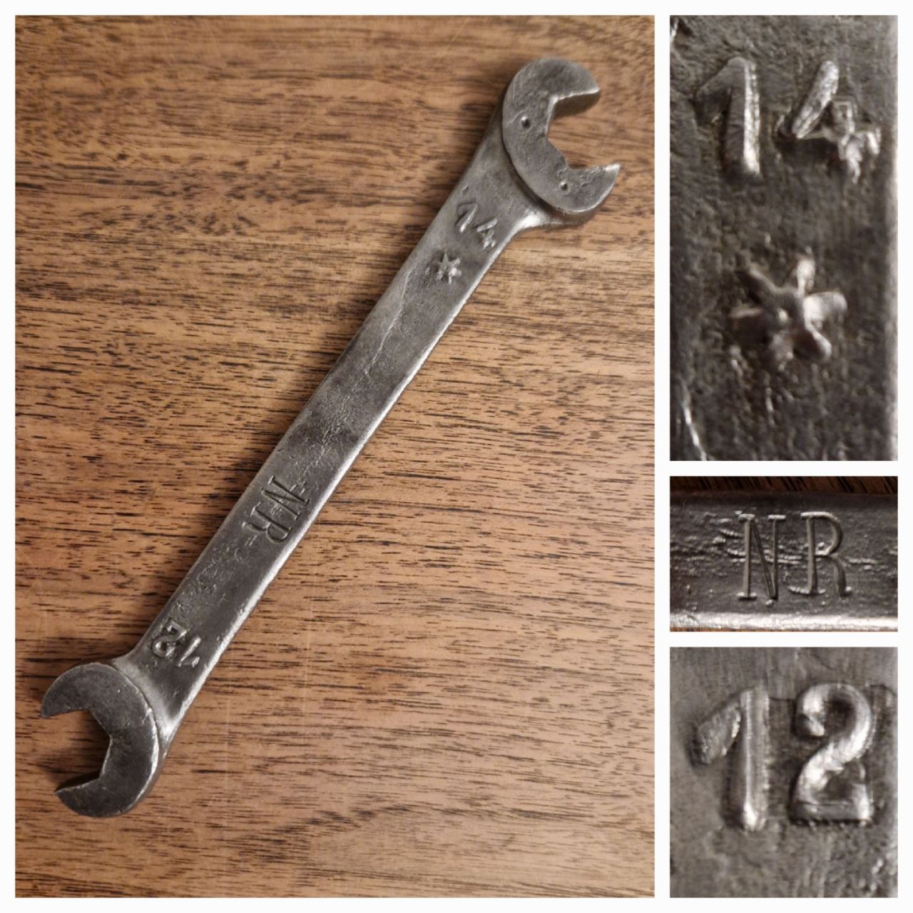 Dieser 13,8 cm lange Maulschraubenschlüssel mit integrierten Ringschlüsseln stammt