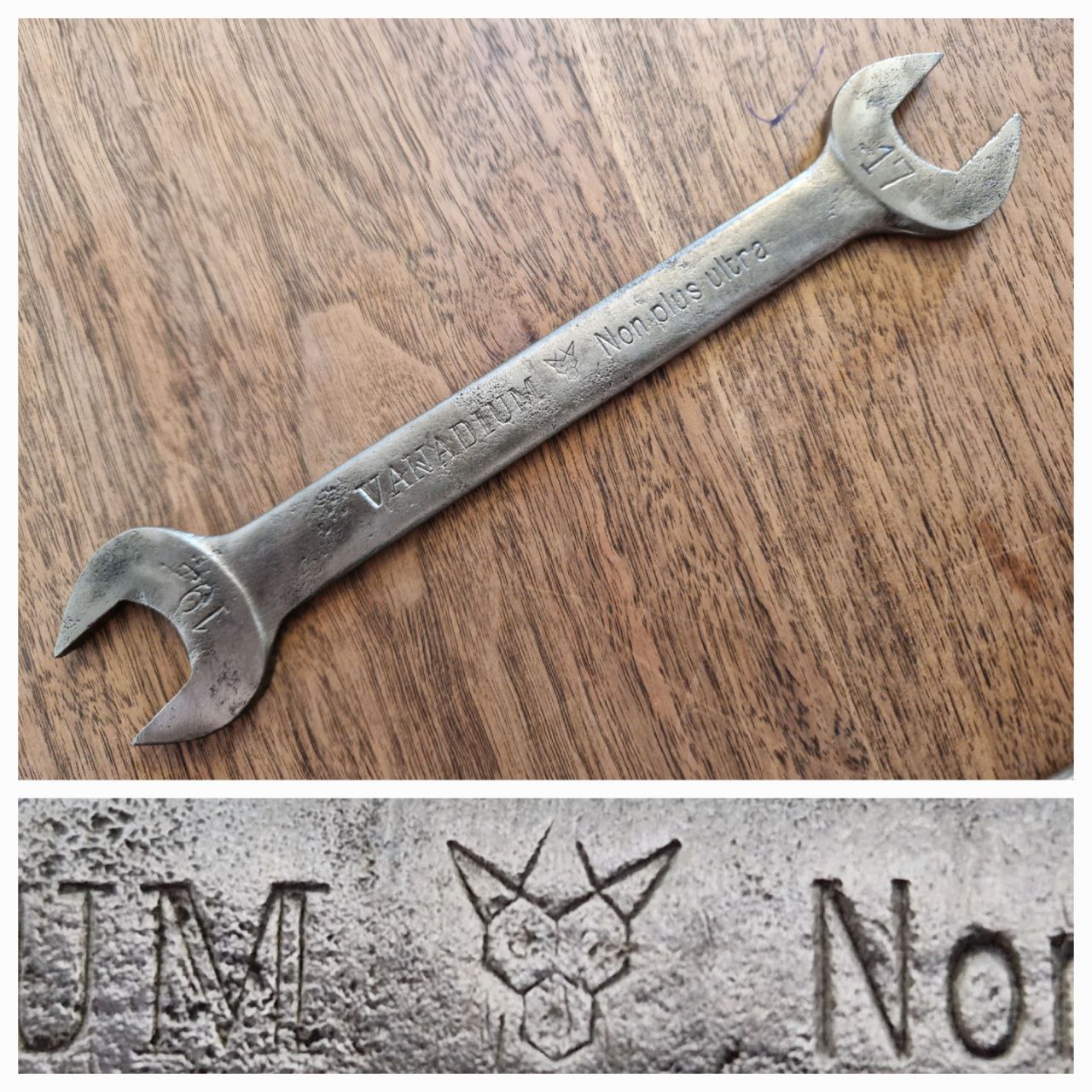 Den fünften Schlüssel zieren neben einem witzig stilisierten Fuchsengesicht die Markierungen: „19 VANADIUM Non plus ultra 17“. Das lustige Fuchslogo, das aus einem Zeichentrick entsprungen sein könnte, gehört zu der heute noch existierenden Firma Schröckenfux, die tatsächlich schon 1540 gegründet wurde. Das österreichische Unternehmen hat schon in seinen mittelalterlichen Ursprüngen Sensen geschmiedet und hat sich bis heute auf Mähmesser spezialisiert.